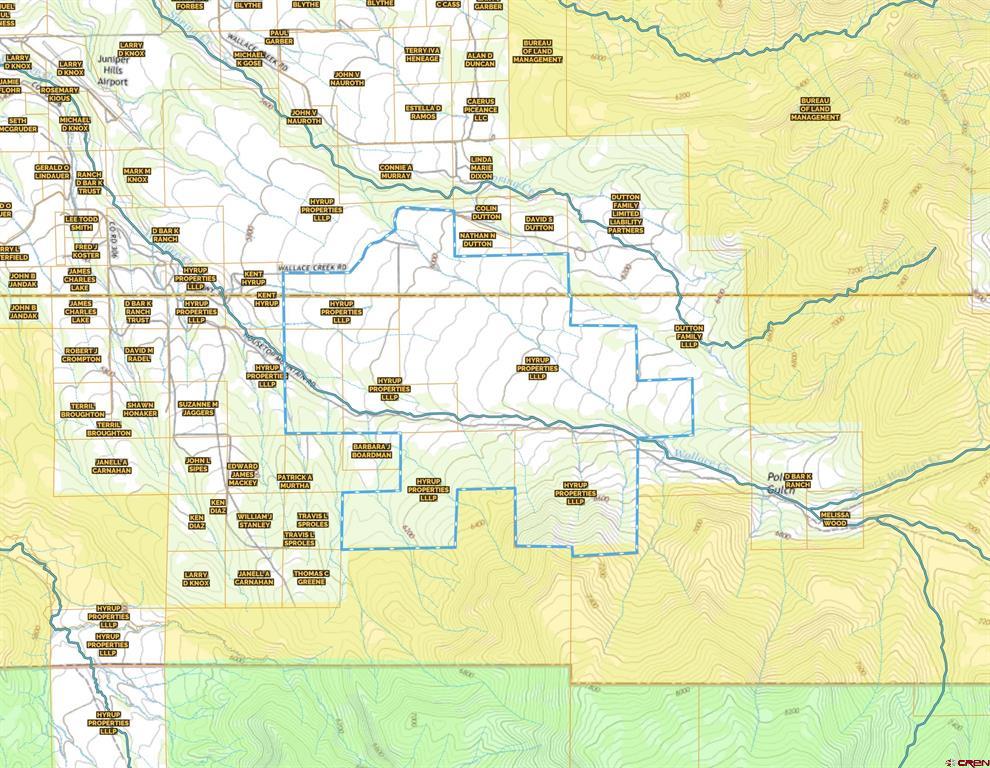 With 1,440+/- deeded acres, Wallace Creek Ranch represents a unique opportunity for ownership of a beautiful recreational, big game hunting, livestock, and wildlife preserve right here on the Western Slope of Colorado. With the White River National Forest to the south and the Bookcliffs to the north, Wallace Creek Ranch offers gorgeous mountain and valley views in every direction. There is excellent access to adjoining BLM lands with the National Forest only a short 1/2 mile away. Ranch elevations are between 5700’ to 6600’ with a nice mix of cedar, piñon pine, and oaks, along with irrigated pastures/hay fields, mountain meadows, and cottonwoods along the creek. Exceptional big game hunting for elk, deer, bear, and turkeys on both the deeded and public lands. Whether it’s hiking, biking, hunting, livestock, observing the abundant wildlife or just relaxing – Wallace Creek Ranch might be the perfect fit! Hunting - The Ranch is situated in Game Management Unit 42 with over the counter elk tags and qualifies for deer vouchers annually. Excellent big game hunting for elk, deer, and turkeys. As the hunting seasons progress into October and November, there are literally high numbers of elk and deer that migrate onto the ranch and into this corridor. Spring turkey hunting is phenomenal as well. The Ranch is unencumbered by conservation easements. The Wallace Creek Ranch has it all with big game hunting, livestock operation, hay production with excellent water rights, with both BLM and NF lands out the back door with endless recreational and wildlife opportunities! Wallace Creek Ranch consists of 1,440+/- acres and shares a common boundary with BLM lands for 2+/- miles, plus the White River National Forest is only a 1/2 mile away. There are approximately 350+/- acres of irrigated pasture/hay meadows with good water rights and production. There are side roll sprinklers included, along with 1 big gun and access to flood irrigation in some areas. Wallace Creek traverses through this parcel for approximately 1 mile, and there is also a small, stocked pond at the upper end. The ranch has historically been used as a cattle operation and includes three BLM allotments.