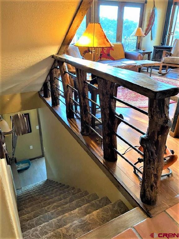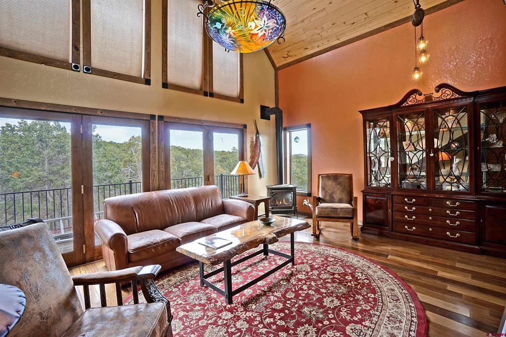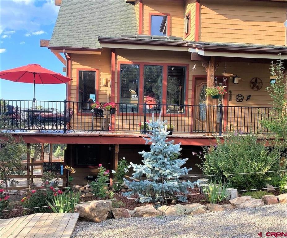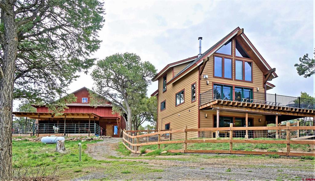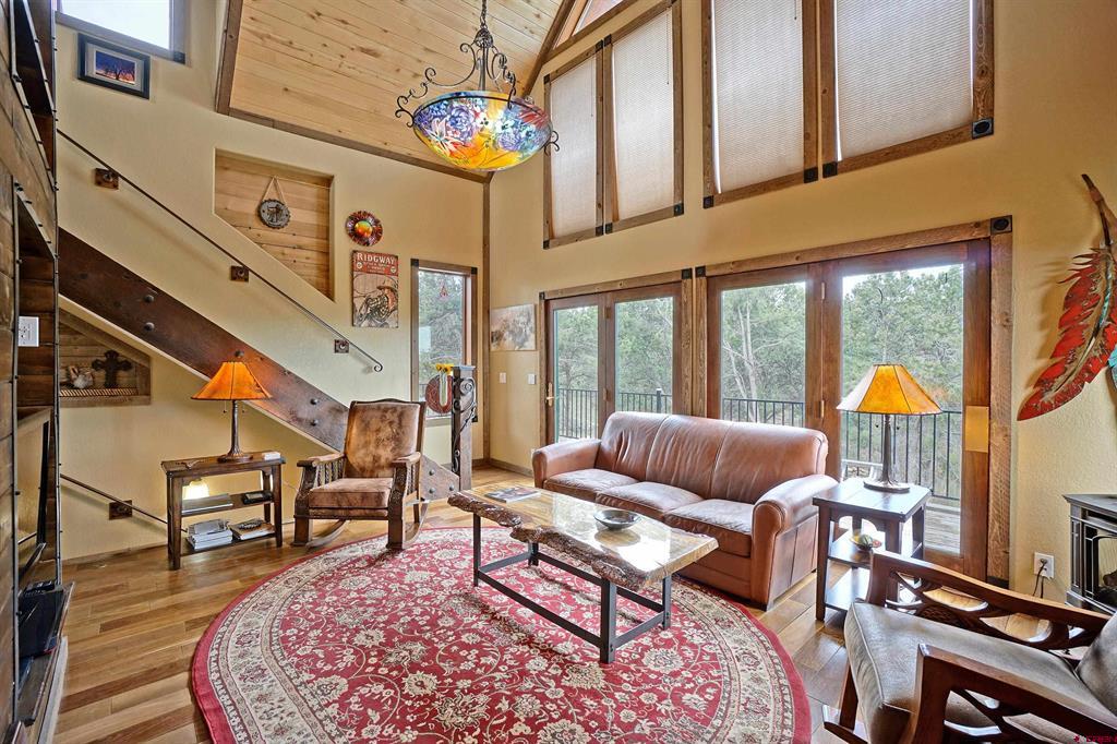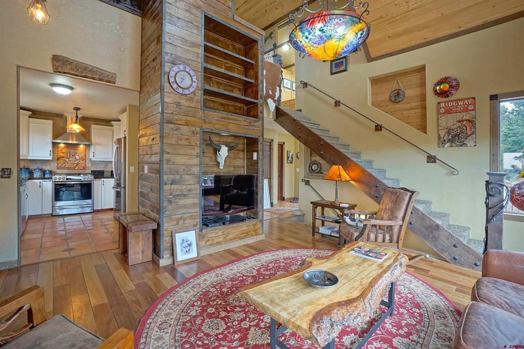 Ridgway, Colorado-sought after mountain town. Exclusive Loghill Village Property in Keller Hills subdivision with No Covenants. Peaceful sanctuary on 4.4+ acres. Reside among the pinions and junipers. Enjoy Cimarron Mt range to the East and view of Grand Mesa to the South from the deck. 1906 SF with 3 B-2 bath. 3 levels : Main level: Open concept with living room and galley kitchen /breakfast room/Mudroom-laundry room & powder room. Loft: master bedroom/master bath/. Walk out basement/garden level: 2 beds /sitting room/bathroom/utility sink/Utility room-electric hot water heater-water softener/ separate entrance) 430 SF wrap around viewing deck. Floor to ceiling viewing windows on the main floor. The house features many fine upgrades such as main level Brazilian walnut and Mexican Saltillo floors. Hand crafted metal stair rails and accents. Galley kitchen, granite counters, custom tile work, gas stove. 2 new Top of the line gas free standing stoves heat the home beautifully. Professionally landscaped with Rock walls/raised walk ways, gardens and a fenced in yard out back. Large 40 X 40 multipurpose heated barn/garage/workshop with two 10’ garage doors and wood stove. Currently set up as an equestrian facility. Property has been fire mitigated and well cared for. Beauty and privacy that only a single family Log Hill home can offer…..Keller Hills subdivision has no covenants.