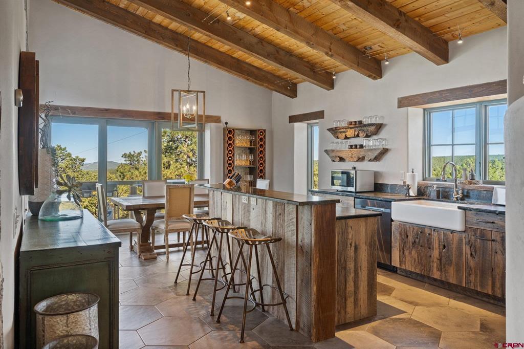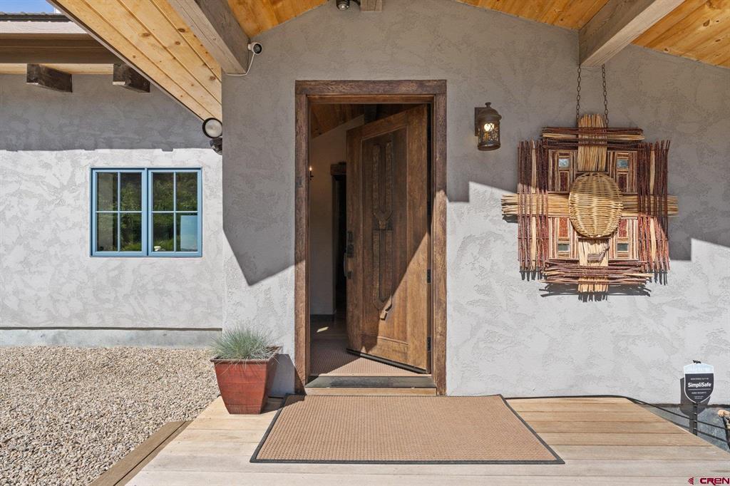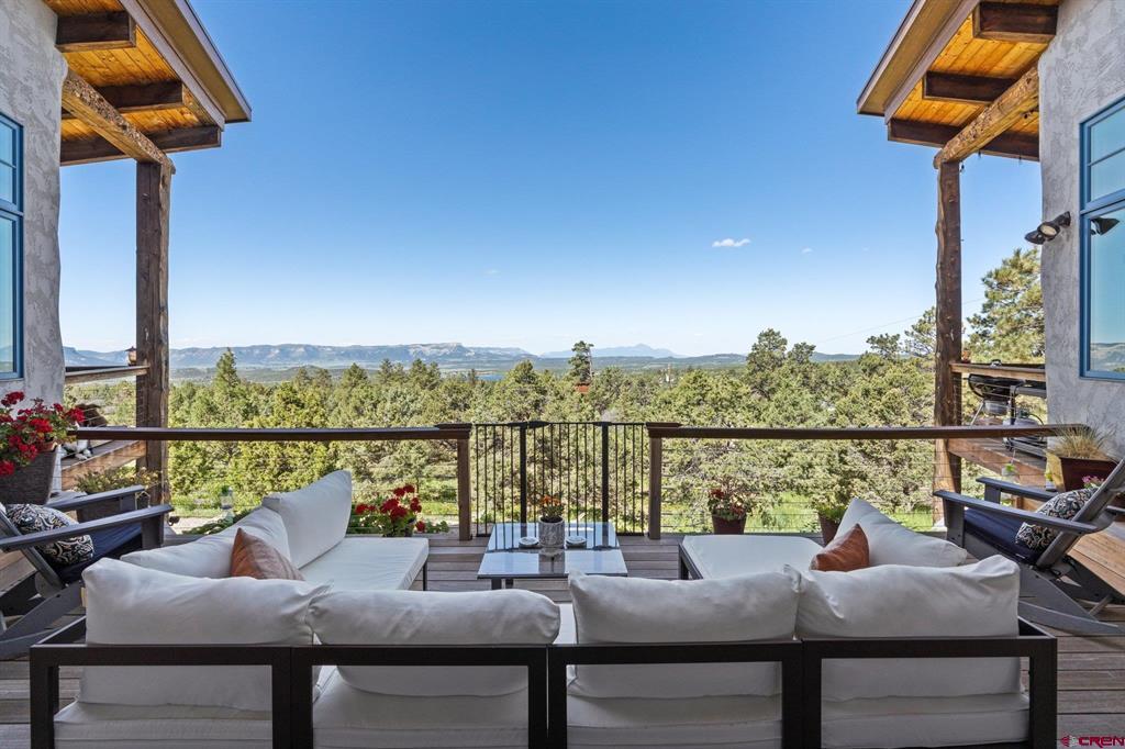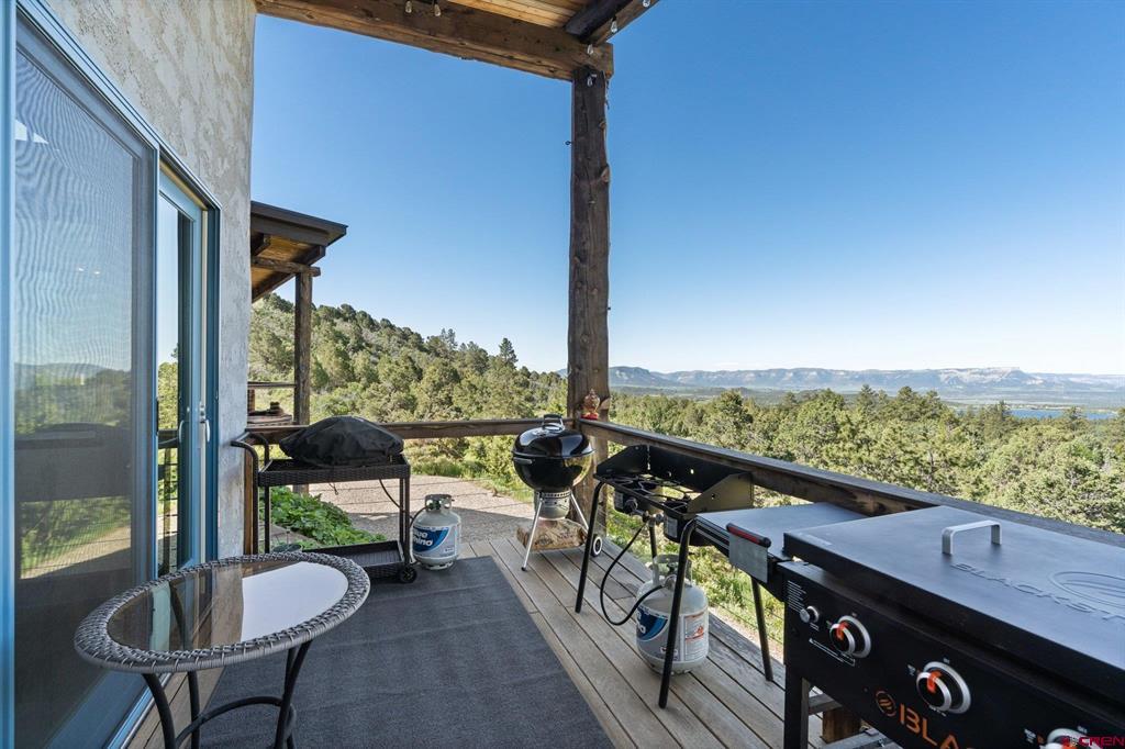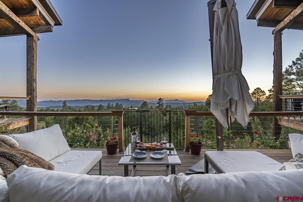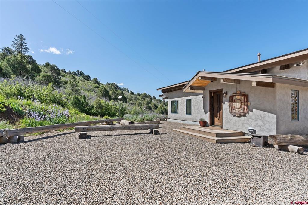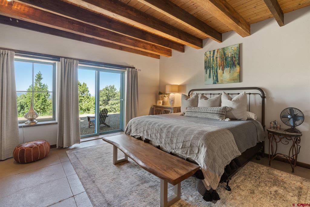 Nestled within tall Pines and breathtaking views of Bauer Lake, Mesa Verde and Sleeping Ute Mountain this artfully designed 3 bedroom, 3 bath, 3000 sq. ft. home along with a two unit, 2000 sq. ft. guest house is captivating. Huge windows bring in the views and provide plenty of natural light. Vaulted ceilings, curved archways, exposed beams, thick wood window sills and antique doors from around the world are just a few of the artistic touches that is warm and inviting. The living room has a gas kiva fireplace and a warm wood floor opens to the kitchen and dining area. A deck off the living room is perfect for entertaining and sunsets. The kitchen has a Tuscan flare with open shelves, large windows, reclaimed barn wood cabinetry and a Bosch chef stove/oven and dishwasher. A small outdoor cooking deck located just off the kitchen is perfect for grills & smokers. The main suite features a private deck, walk-in custom closet, and a luxurious bathroom sheathed in Italian tile, marble counters, a stone shower along with a deep soaking tub. An in wall Modern Flames fireplace panel provides extra warmth and ambience. On the lower level is a kiva lounge with a fireplace, providing a cozy place to read or watch a movie. Two more bedrooms are downstairs, each with their own patios and a shared bathroom, plus an exercise/yoga room. The outdoor hot tub is perfect for stargazing. The 2 story guest house has two separate units. The downstairs one bedroom unit was completely renovated in 2022 with live edge wood doors, granite counter tops, live-edge wood slab shelves and bar, gas heater and stove. It has a private outdoor patio. The upper 1 bedroom +loft unit features high ceilings with 360 degree views, wood plank interior walls and hardwood floors. The open design full kitchen has stainless steel appliances, and ample beautiful blue pine wood kitchen cabinetry, adjacent to an ample yet cozy living area that opens to a deck. The guest home also has an attached heated greenhouse with automated irrigation. These units can be for extra guests, caretaker, or income rental potential of >$2,500 per month. The property has 2 pastures, a 4-stall, 3-sided carport/barn which has plenty of room for lake toys and bikes, a 20 ft. x 20 ft. platform perfect for yoga and group gatherings and fenced garden area. Jackson Lake and the San Juan National Forest are just 1/2 mile away for fishing, paddle boarding, and endless trails for hiking, biking and horse riding. No restrictions or HOA. The home is a Smart Home: locks, lights, and heat can be operated remotely. There is a Simply Safe security system at both the main and guest house. Two Mancos Rural water taps and two high speed internet systems using Starlink are included. This luxurious property with exquisite furnishings and every modern amenity at your fingertips, means you can start living your dream lifestyle as soon as you step inside. 4 miles to Mancos, and 35 minutes to Durango.