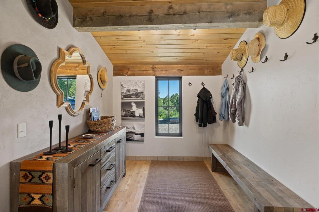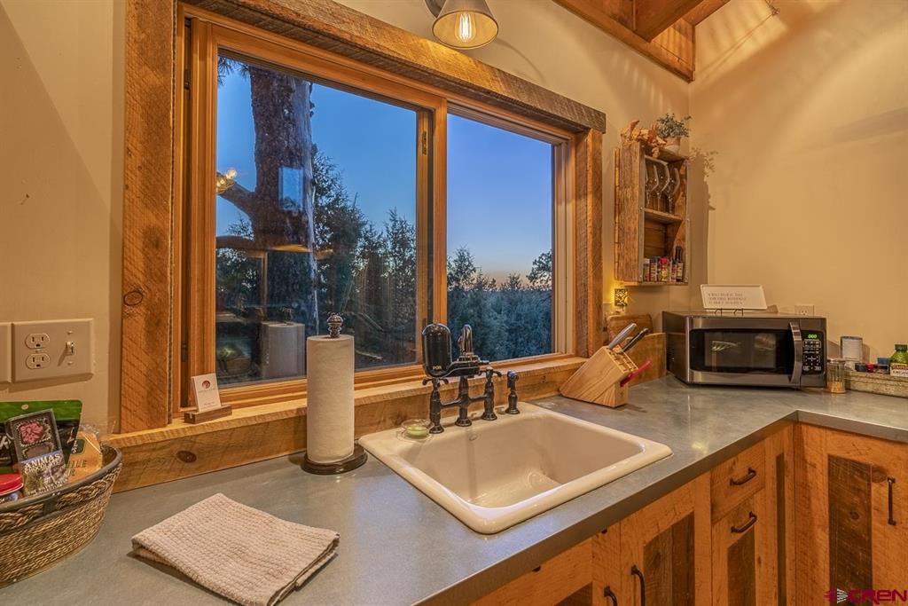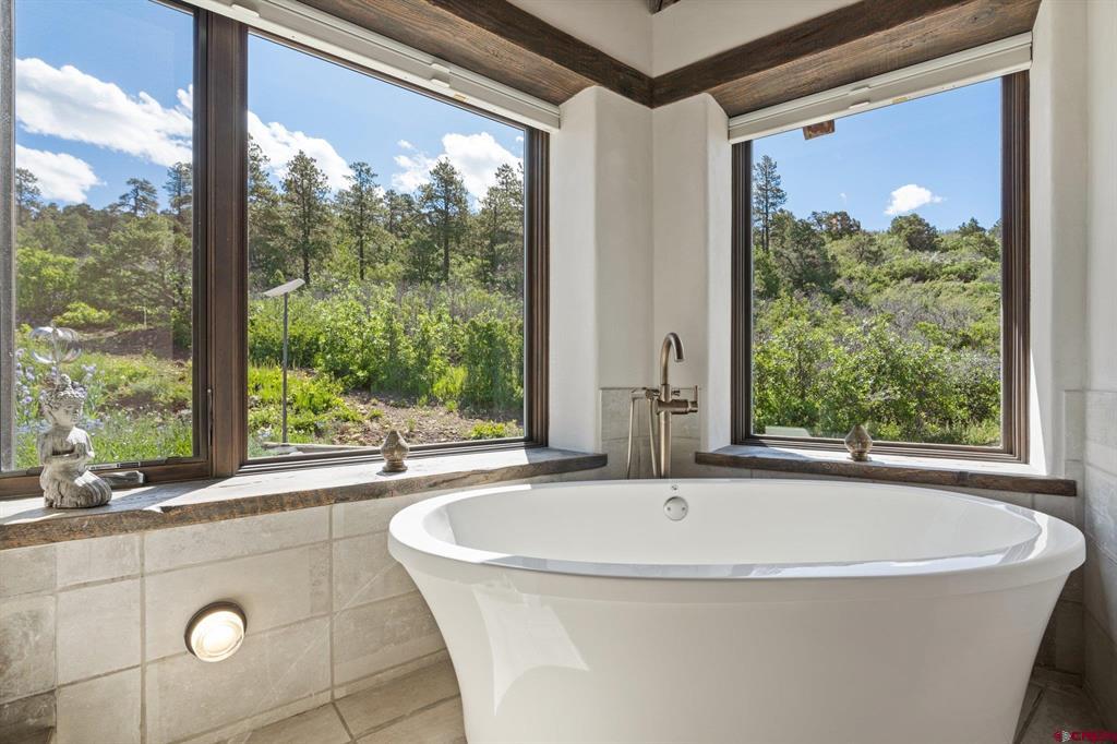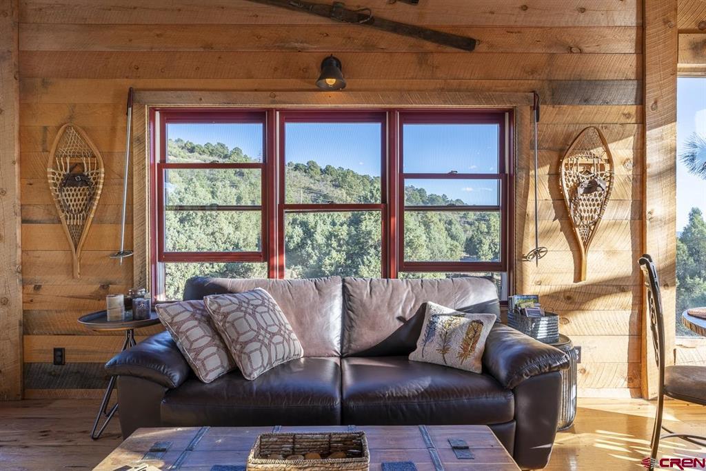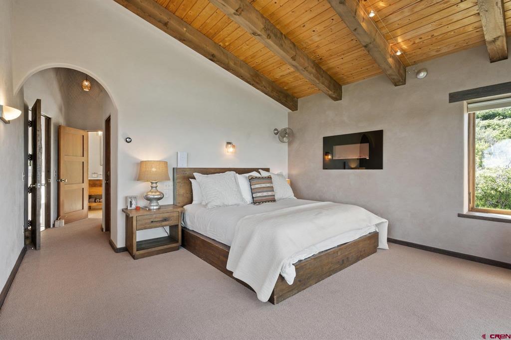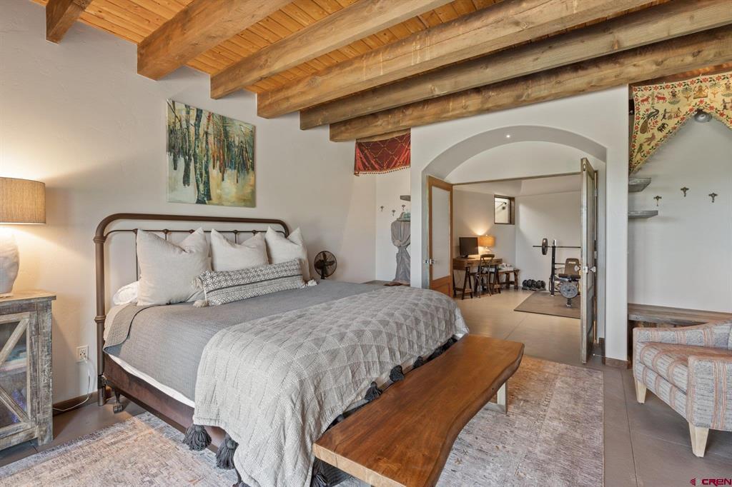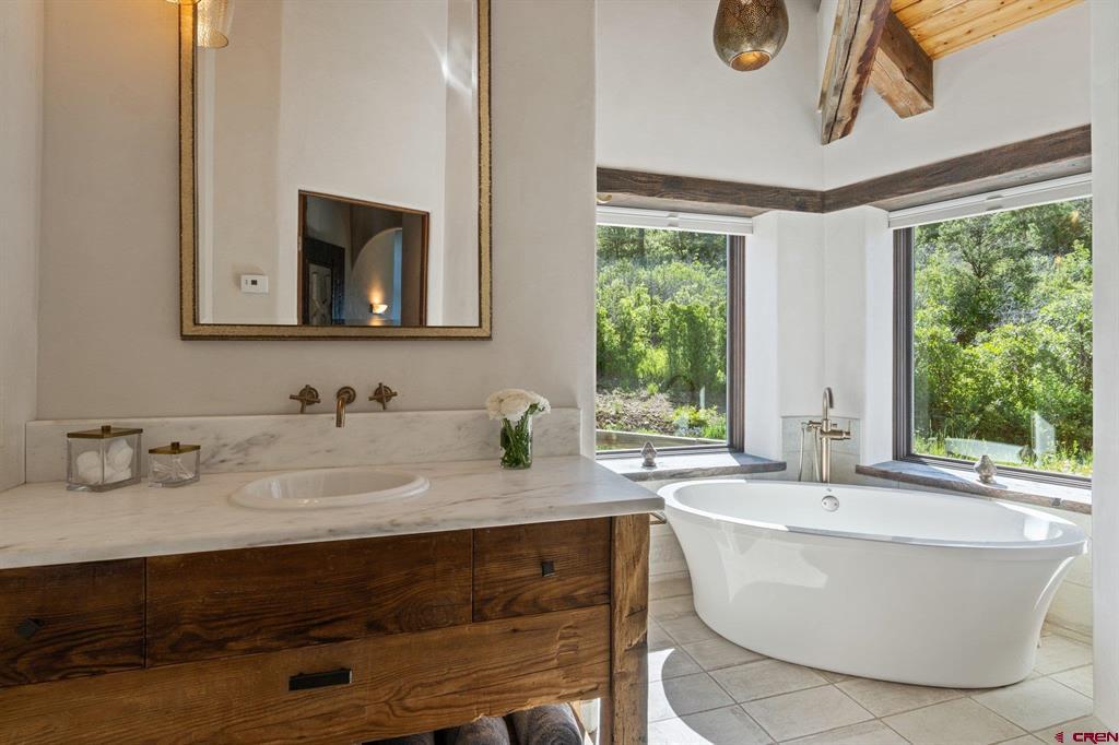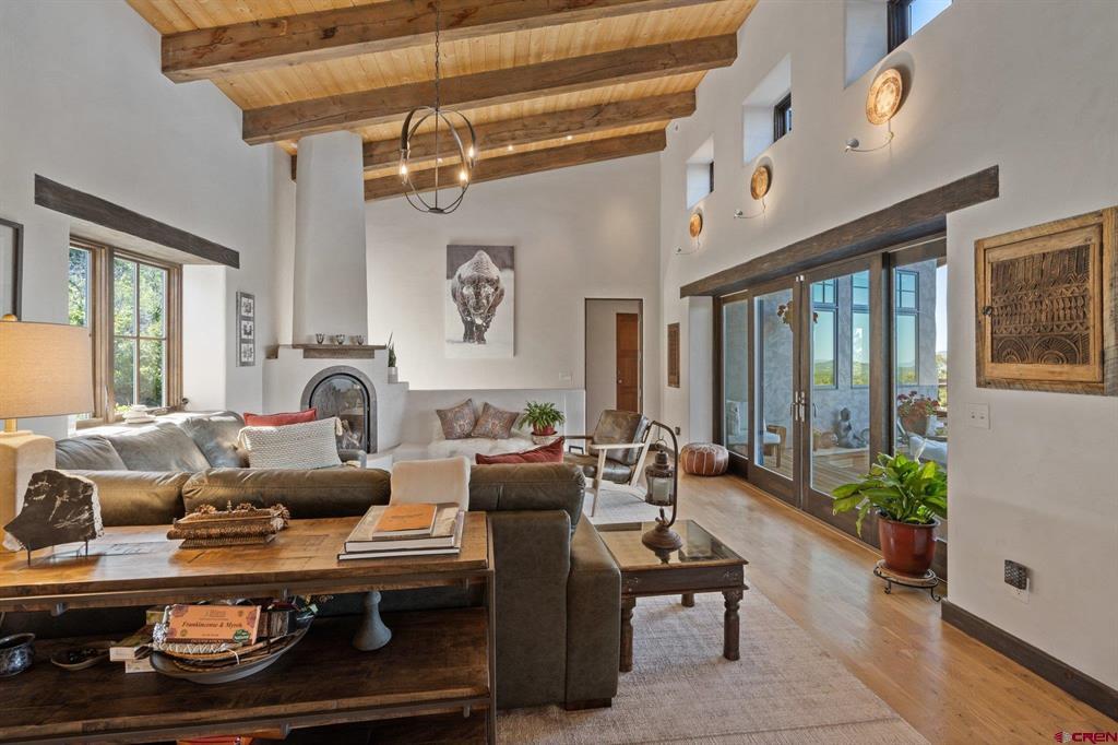 Nestled within tall Pines and breathtaking views of Bauer Lake, Mesa Verde and Sleeping Ute Mountain this artfully designed 3 bedroom, 3 bath, 3000 sq. ft. home along with a two unit, 2000 sq. ft. guest house is captivating. Huge windows bring in the views and provide plenty of natural light. Vaulted ceilings, curved archways, exposed beams, thick wood window sills and antique doors from around the world are just a few of the artistic touches that is warm and inviting. The living room has a gas kiva fireplace and a warm wood floor opens to the kitchen and dining area. A deck off the living room is perfect for entertaining and sunsets. The kitchen has a Tuscan flare with open shelves, large windows, reclaimed barn wood cabinetry and a Bosch chef stove/oven and dishwasher. A small outdoor cooking deck located just off the kitchen is perfect for grills & smokers. The main suite features a private deck, walk-in custom closet, and a luxurious bathroom sheathed in Italian tile, marble counters, a stone shower along with a deep soaking tub. An in wall Modern Flames fireplace panel provides extra warmth and ambience. On the lower level is a kiva lounge with a fireplace, providing a cozy place to read or watch a movie. Two more bedrooms are downstairs, each with their own patios and a shared bathroom, plus an exercise/yoga room. The outdoor hot tub is perfect for stargazing. The 2 story guest house has two separate units. The downstairs one bedroom unit was completely renovated in 2022 with live edge wood doors, granite counter tops, live-edge wood slab shelves and bar, gas heater and stove. It has a private outdoor patio. The upper 1 bedroom +loft unit features high ceilings with 360 degree views, wood plank interior walls and hardwood floors. The open design full kitchen has stainless steel appliances, and ample beautiful blue pine wood kitchen cabinetry, adjacent to an ample yet cozy living area that opens to a deck. The guest home also has an attached heated greenhouse with automated irrigation. These units can be for extra guests, caretaker, or income rental potential of >$2,500 per month. The property has 2 pastures, a 4-stall, 3-sided carport/barn which has plenty of room for lake toys and bikes, a 20 ft. x 20 ft. platform perfect for yoga and group gatherings and fenced garden area. Jackson Lake and the San Juan National Forest are just 1/2 mile away for fishing, paddle boarding, and endless trails for hiking, biking and horse riding. No restrictions or HOA. The home is a Smart Home: locks, lights, and heat can be operated remotely. There is a Simply Safe security system at both the main and guest house. Two Mancos Rural water taps and two high speed internet systems using Starlink are included. This luxurious property with exquisite furnishings and every modern amenity at your fingertips, means you can start living your dream lifestyle as soon as you step inside. 4 miles to Mancos, and 35 minutes to Durango.