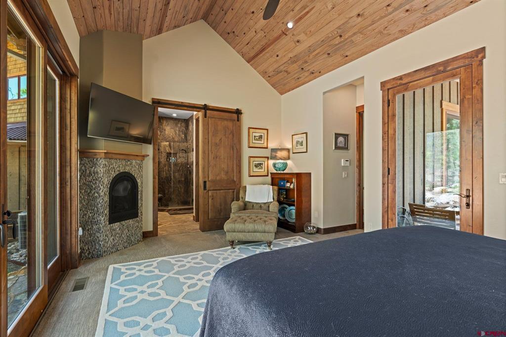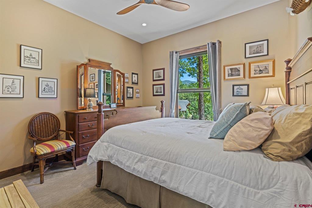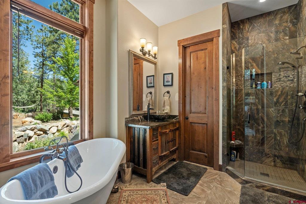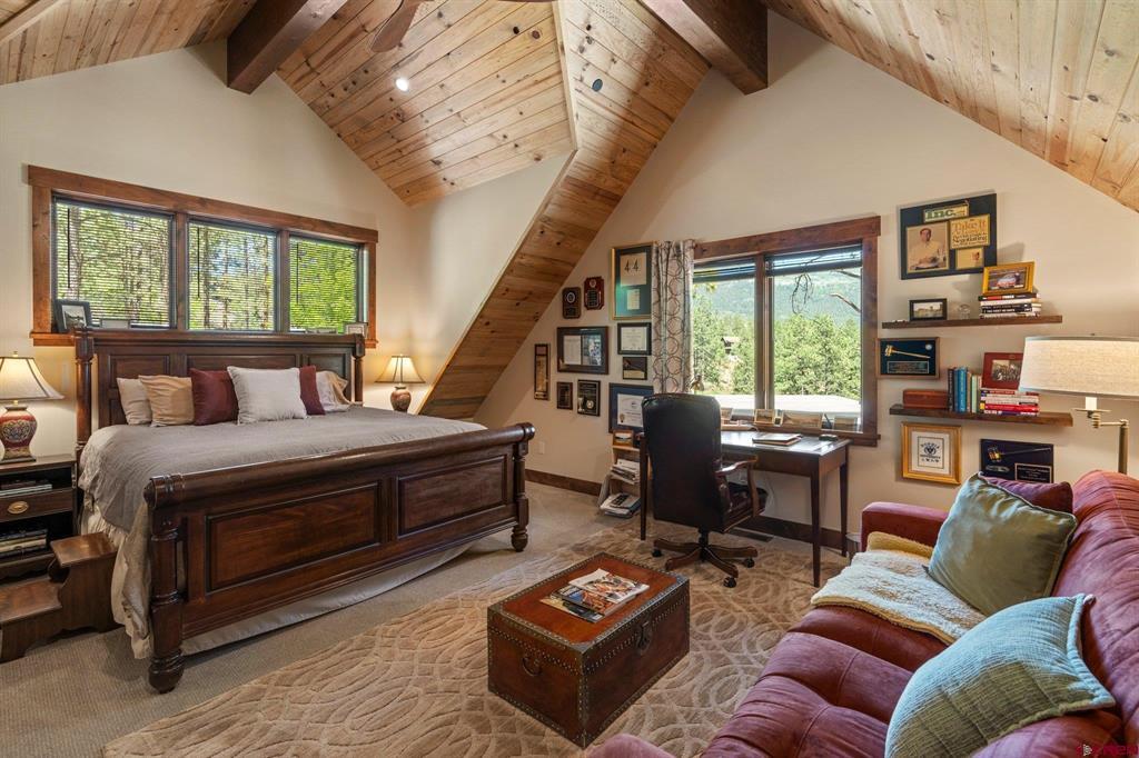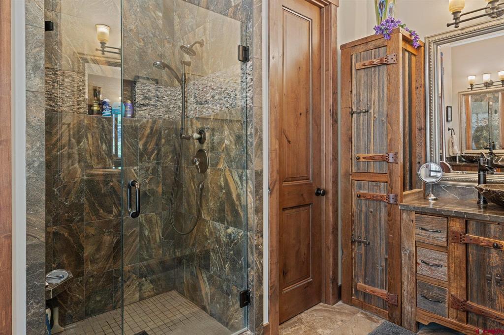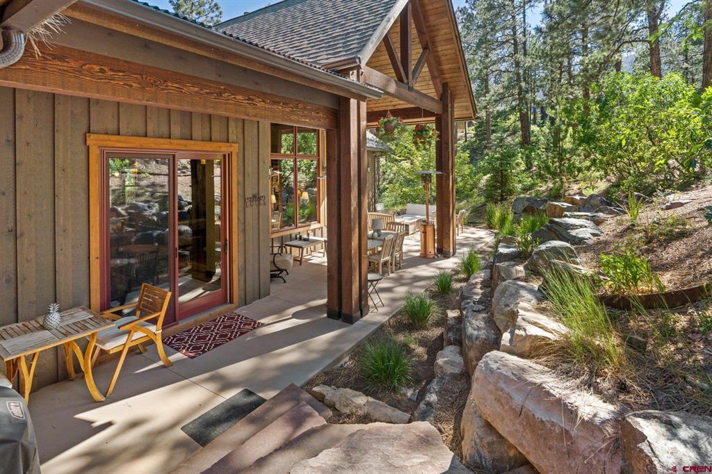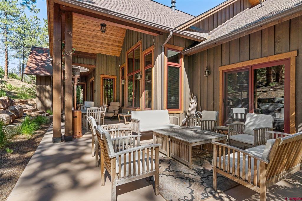 A single-family mountain traditional masterpiece with sweeping views of Missionary Ridge and private outdoor living space in the coveted Glacier community doesn’t come up often and this gem is not to be missed! Built in 2016 by Cerwin Homes, this exquisite home is adorned with extravagant features such as custom finished in place stunning wood flooring with, a two-sided natural stone gas fireplace illuminating both the dining room and living area, tongue and groove vaulted ceilings, and newly upgraded kitchen completed in 2023 with larger island, new granite, and lighting. The spacious and well-equipped kitchen will allow your inner chef to flourish, and the sizeable dining area and separate media room satisfies all your entertainment needs. The main level hosts a guest bedroom, large office that is currently configured as a guest bedroom, as well as the spacious primary bedroom with bath, highlighted by a gorgeous garden tub, offering peace and relaxation after a day playing in the mountains. A heated 3 car garage with recently reconfigured and enlarged opening ensures you have plenty of space and comfort for working on and storing your mountain lifestyle toys. Venturing upstairs you find a large and spacious guest bedroom, as well as a added home office / workout room that can be configured to suit your lifestyle needs. Step outside to one of your two large, private, fully landscaped, outdoor living spaces, to either enjoy dining on the covered patio or to gather around the natural gas fire pit to roast marshmallows and star gaze. This special home truly holds all the elements one seeks in a luxury home and lifestyle. The Glacier community features a plethora of amenities; including, the Mountain Clubhouse, which offers incredible dining, swimming pool, hot tub, and access to 36 holes of pure mountain golf as well as tennis and pickle ball. Also onsite is the Valley Clubhouse, which also hosts excellent dining at the Mineshaft restaurant and features a new fitness facility, two more pools, an additional hot tub, park, playground for the kids and indoor golf simulator in the winter. With Purgatory ski resort just a short 8-mile drive to the north and historic downtown Durango 16 miles to the south, this is an idyllic setting is one of the finest golf communities in the west.