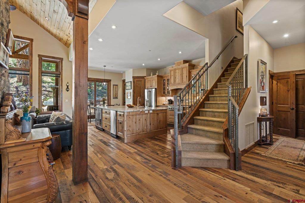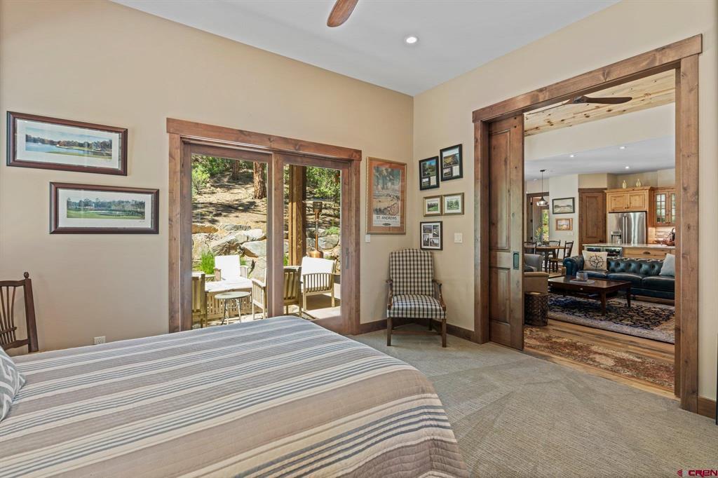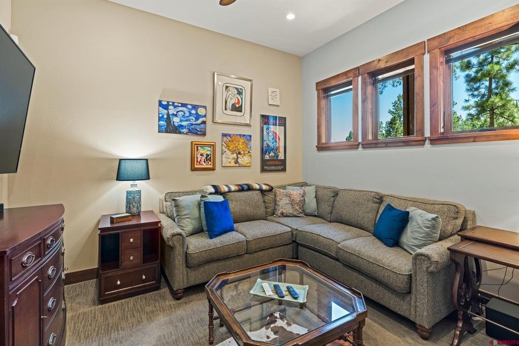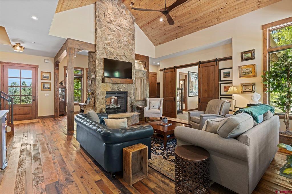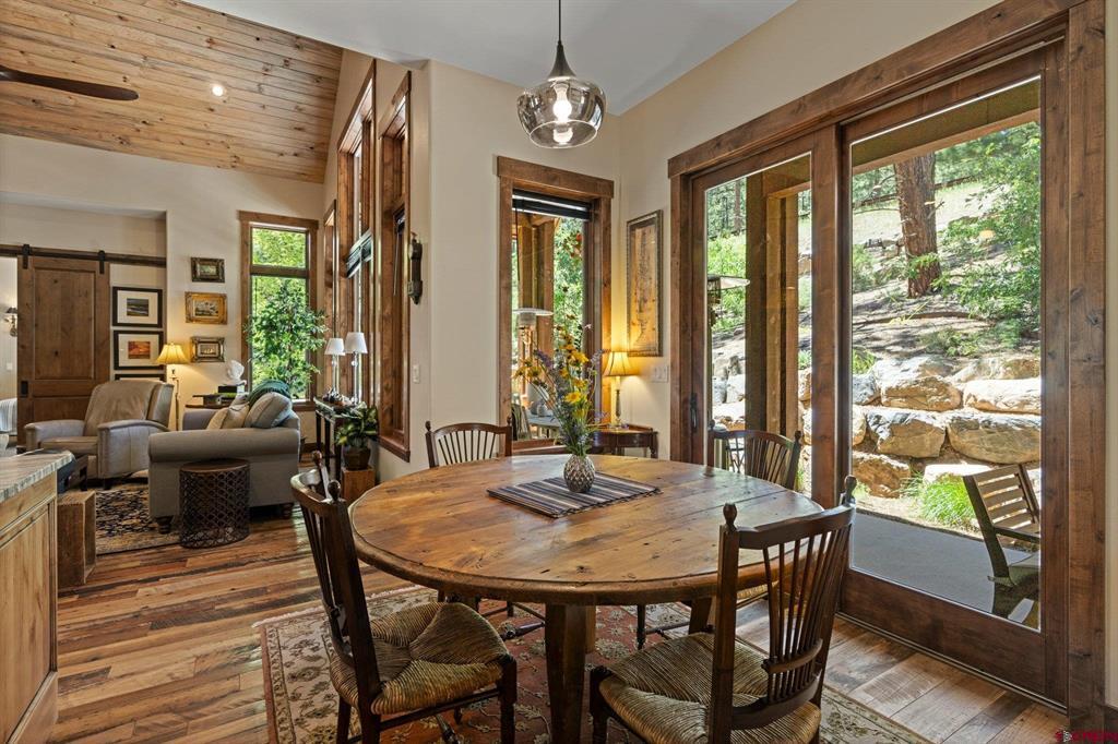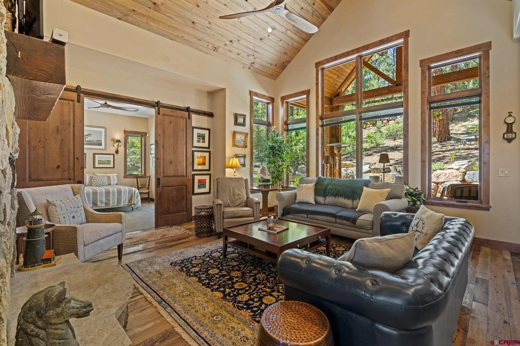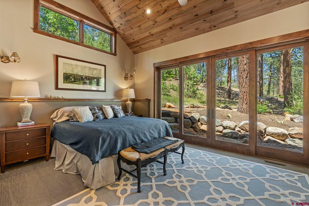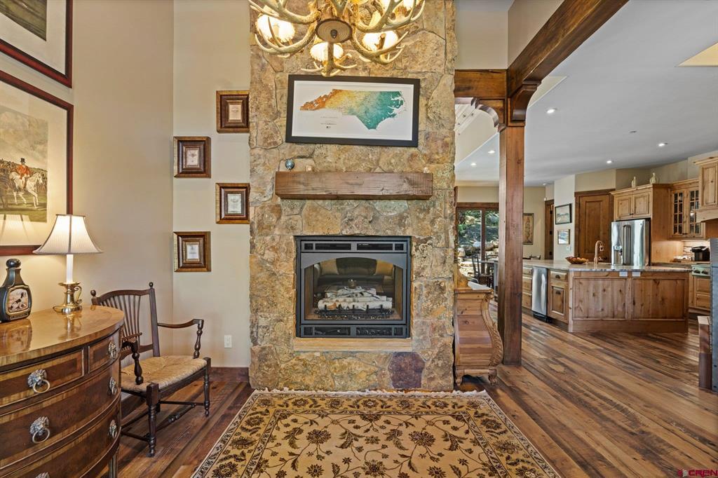 A single-family mountain traditional masterpiece with sweeping views of Missionary Ridge and private outdoor living space in the coveted Glacier community doesn’t come up often and this gem is not to be missed! Built in 2016 by Cerwin Homes, this exquisite home is adorned with extravagant features such as custom finished in place stunning wood flooring with, a two-sided natural stone gas fireplace illuminating both the dining room and living area, tongue and groove vaulted ceilings, and newly upgraded kitchen completed in 2023 with larger island, new granite, and lighting. The spacious and well-equipped kitchen will allow your inner chef to flourish, and the sizeable dining area and separate media room satisfies all your entertainment needs. The main level hosts a guest bedroom, large office that is currently configured as a guest bedroom, as well as the spacious primary bedroom with bath, highlighted by a gorgeous garden tub, offering peace and relaxation after a day playing in the mountains. A heated 3 car garage with recently reconfigured and enlarged opening ensures you have plenty of space and comfort for working on and storing your mountain lifestyle toys. Venturing upstairs you find a large and spacious guest bedroom, as well as a added home office / workout room that can be configured to suit your lifestyle needs. Step outside to one of your two large, private, fully landscaped, outdoor living spaces, to either enjoy dining on the covered patio or to gather around the natural gas fire pit to roast marshmallows and star gaze. This special home truly holds all the elements one seeks in a luxury home and lifestyle. The Glacier community features a plethora of amenities; including, the Mountain Clubhouse, which offers incredible dining, swimming pool, hot tub, and access to 36 holes of pure mountain golf as well as tennis and pickle ball. Also onsite is the Valley Clubhouse, which also hosts excellent dining at the Mineshaft restaurant and features a new fitness facility, two more pools, an additional hot tub, park, playground for the kids and indoor golf simulator in the winter. With Purgatory ski resort just a short 8-mile drive to the north and historic downtown Durango 16 miles to the south, this is an idyllic setting is one of the finest golf communities in the west.