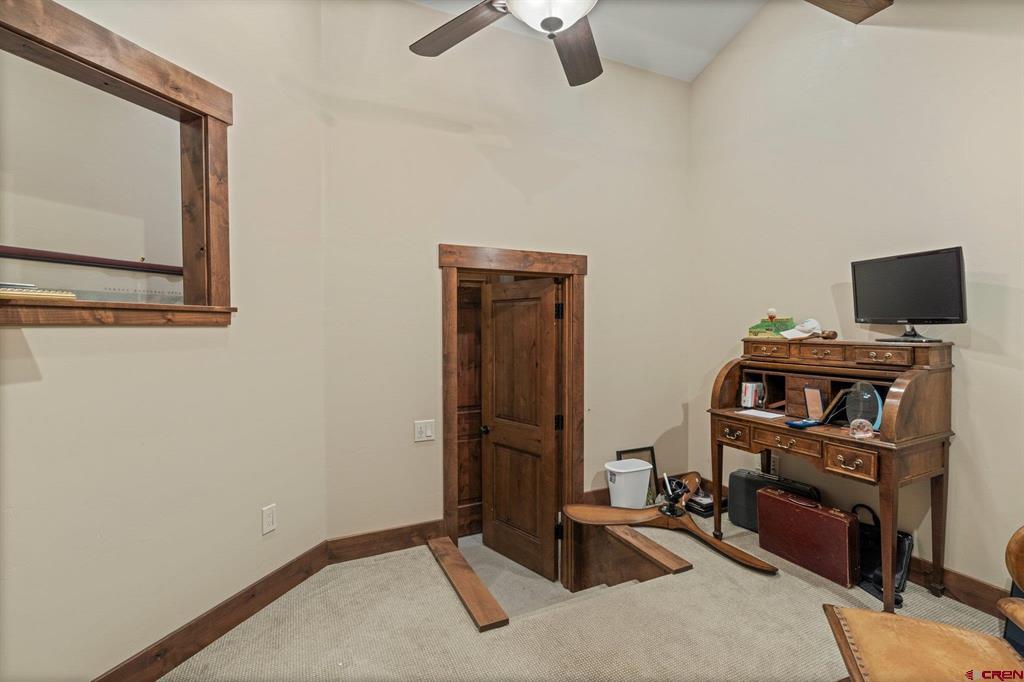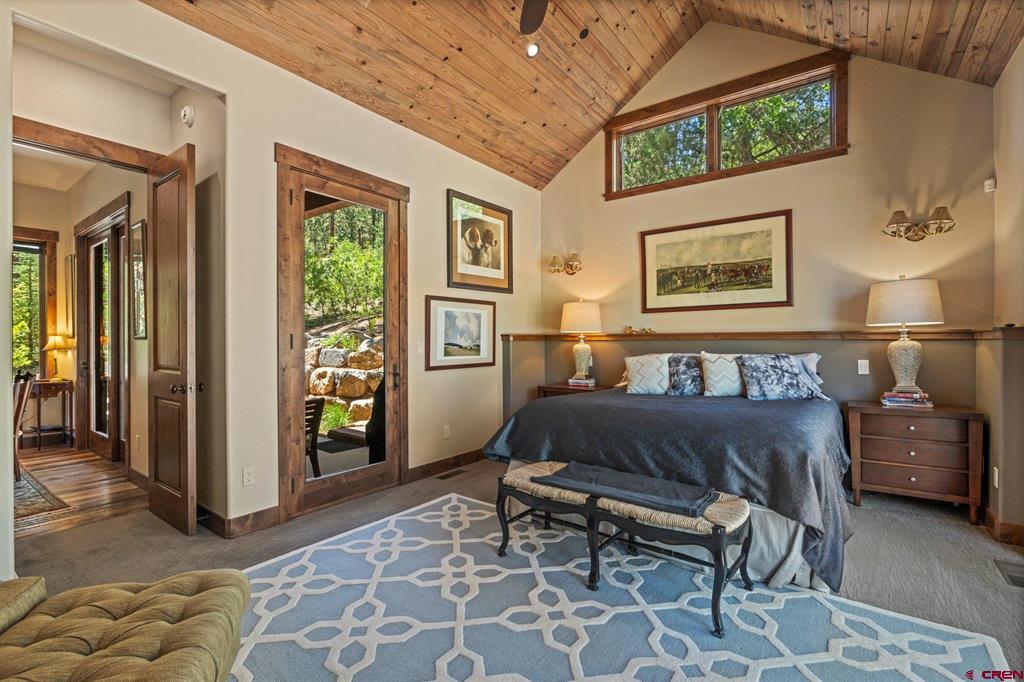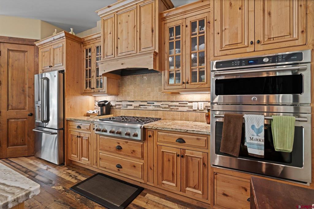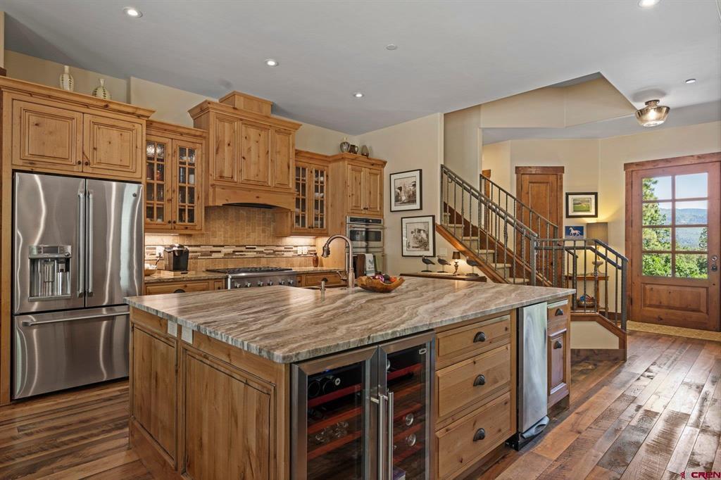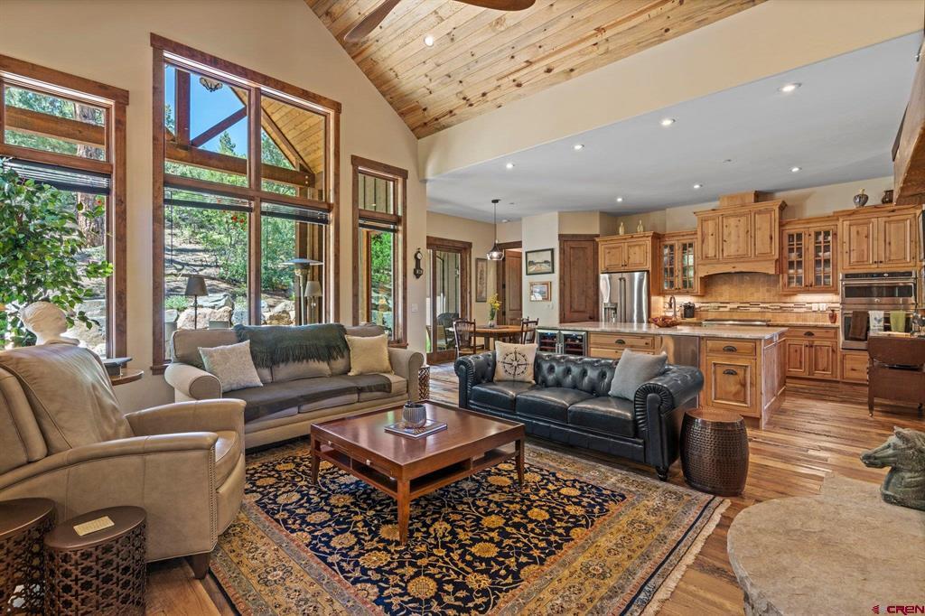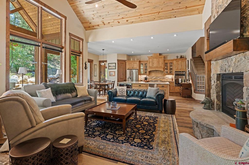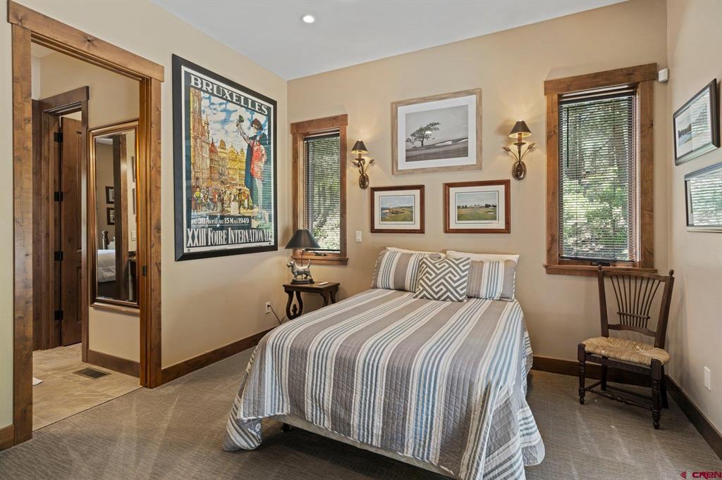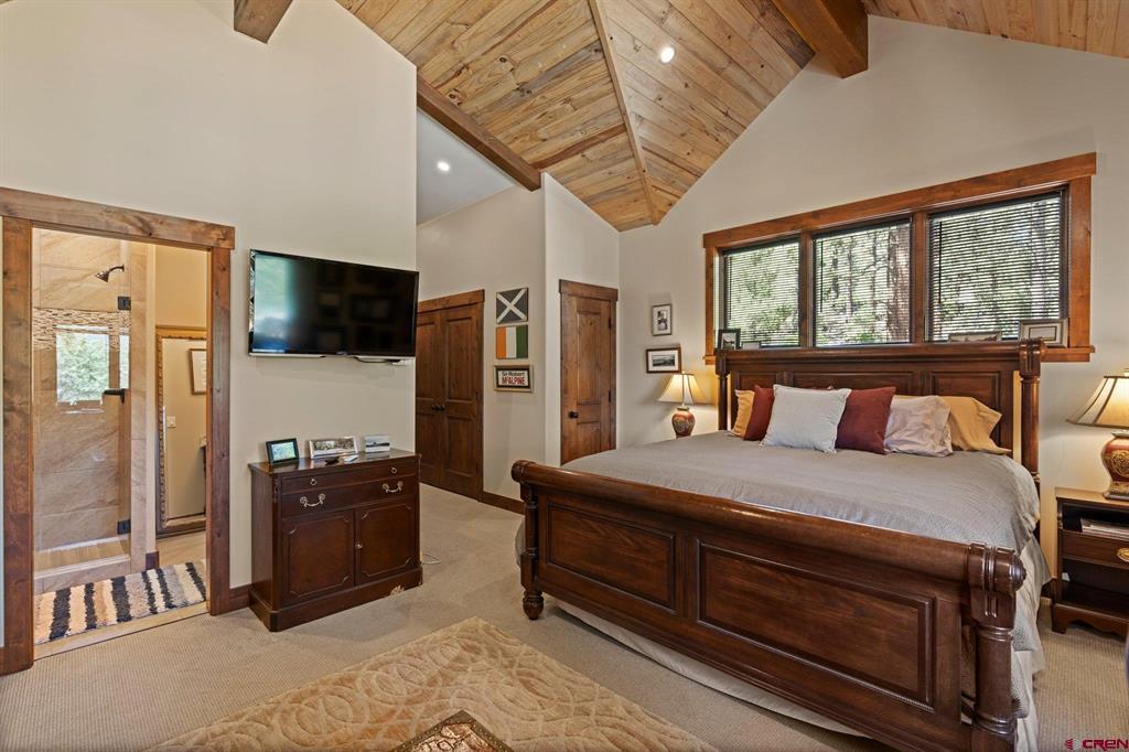 A single-family mountain traditional masterpiece with sweeping views of Missionary Ridge and private outdoor living space in the coveted Glacier community doesn’t come up often and this gem is not to be missed! Built in 2016 by Cerwin Homes, this exquisite home is adorned with extravagant features such as custom finished in place stunning wood flooring with, a two-sided natural stone gas fireplace illuminating both the dining room and living area, tongue and groove vaulted ceilings, and newly upgraded kitchen completed in 2023 with larger island, new granite, and lighting. The spacious and well-equipped kitchen will allow your inner chef to flourish, and the sizeable dining area and separate media room satisfies all your entertainment needs. The main level hosts a guest bedroom, large office that is currently configured as a guest bedroom, as well as the spacious primary bedroom with bath, highlighted by a gorgeous garden tub, offering peace and relaxation after a day playing in the mountains. A heated 3 car garage with recently reconfigured and enlarged opening ensures you have plenty of space and comfort for working on and storing your mountain lifestyle toys. Venturing upstairs you find a large and spacious guest bedroom, as well as a added home office / workout room that can be configured to suit your lifestyle needs. Step outside to one of your two large, private, fully landscaped, outdoor living spaces, to either enjoy dining on the covered patio or to gather around the natural gas fire pit to roast marshmallows and star gaze. This special home truly holds all the elements one seeks in a luxury home and lifestyle. The Glacier community features a plethora of amenities; including, the Mountain Clubhouse, which offers incredible dining, swimming pool, hot tub, and access to 36 holes of pure mountain golf as well as tennis and pickle ball. Also onsite is the Valley Clubhouse, which also hosts excellent dining at the Mineshaft restaurant and features a new fitness facility, two more pools, an additional hot tub, park, playground for the kids and indoor golf simulator in the winter. With Purgatory ski resort just a short 8-mile drive to the north and historic downtown Durango 16 miles to the south, this is an idyllic setting is one of the finest golf communities in the west.