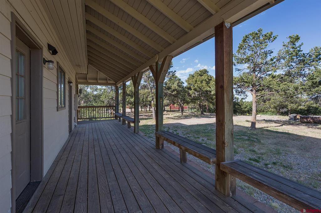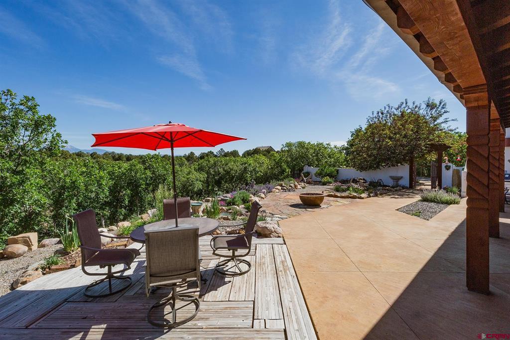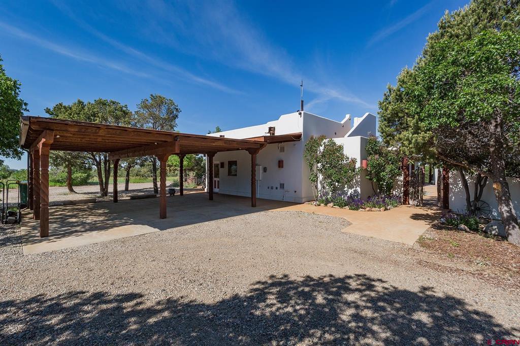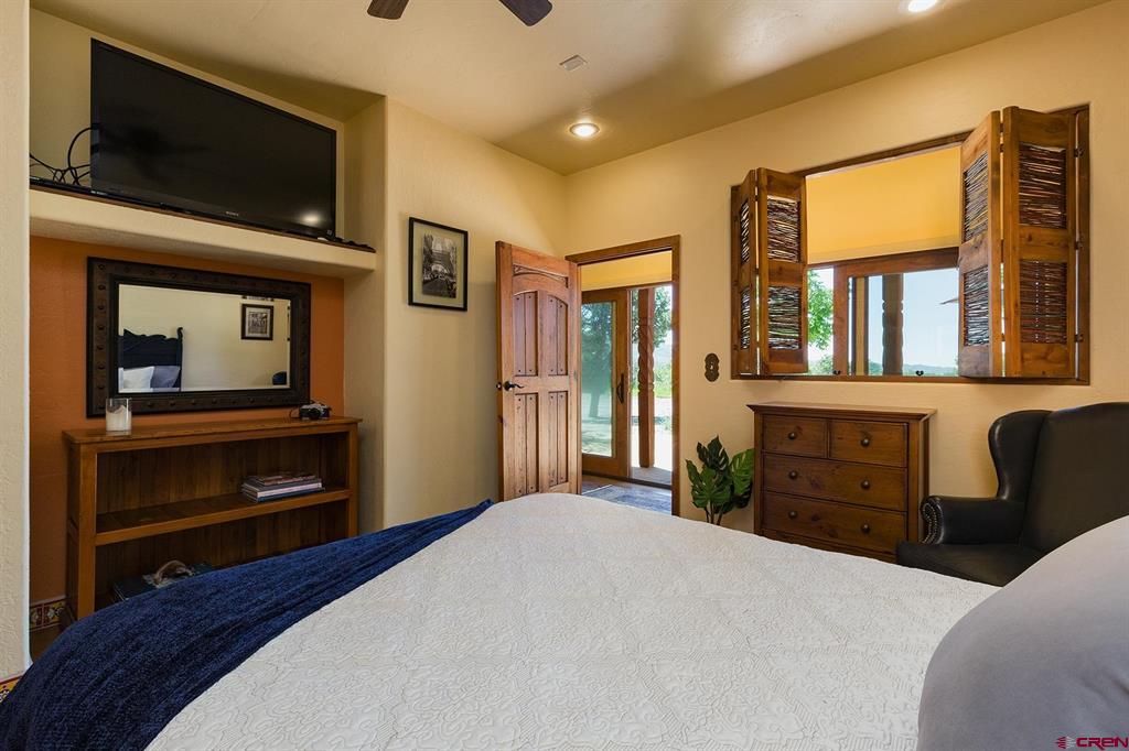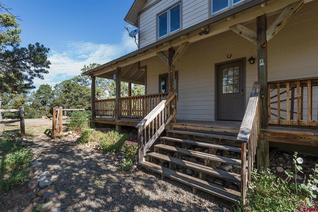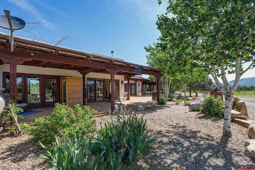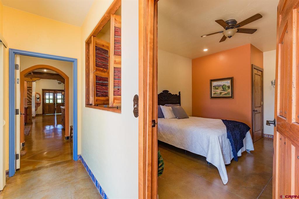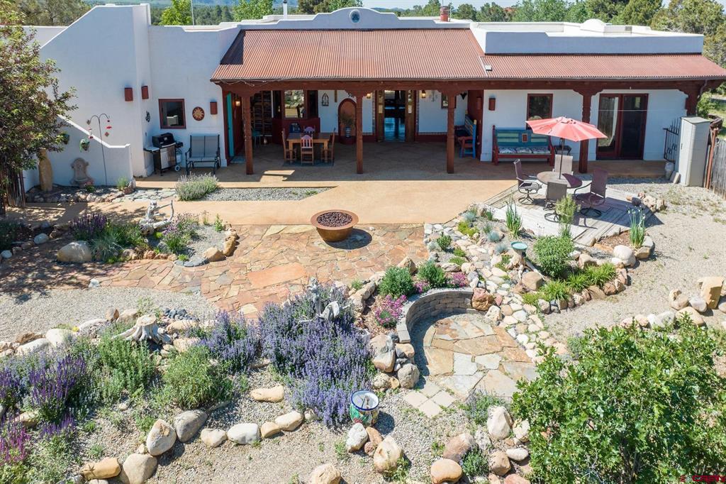 Welcome to this magnificent property which offers 2 single family homes nestled on 35 acres of picturesque land, just 11 miles (approx. 15 min) from downtown Durango, with clear views of the La Plata mountains. Located in a serene and tranquil setting, this property offers a perfect blend of natural beauty, privacy, and endless possibilities. As you approach the property, a private driveway leads you to the three bedroom guest house, the Santa Fe style main house, hay barn, chicken coop, and main barn/garage with studio above. The land boasts a diverse natural landscape with rolling hills, creating a harmonious balance between open spaces and intimate retreats. The property offers ample opportunities for outdoor enthusiasts and nature lovers, anything from horseback riding, gardening, workshop, or simply enjoying the quiet and expansive views. The enchanting Santa Fe style home effortlessly captures the essence of Southwestern architecture and design. The traditional flat roof has stairs leading to it so that it could be used to enjoy the wonderful sunsets and Alpen glow over the La Plata mountains. Upon entering the 2 bed 2.5 bath single level home, you’re welcomed into a spacious open floor plan, featuring an abundance of natural light. The living room includes floor to ceiling windows with doors out to the back patio, concrete floor throughout, and rustic elements. To the right of the living room are the double doors to the master suite including a large walk-in closet with attached laundry room, a spacious office with double doors, an ensuite bath, and a nook currently used as an office/workout/studio space, with double doors out to the patio. The left of the living room includes the kitchen and dining room area with a bar island separating the living room and kitchen area. The kitchen includes a tile island, tile countertops, and a walk-in pantry with built in cabinetry custom to the home. Off the Kitchen there’s a door to the hallway leading to the other bedroom with ensuite bathroom. Beyond that is the utility room/ shop room that leads you out to the covered car port. This home is ADA compliant, wheelchair assessable. The home includes a covered front and back patio, with a beautiful well-kept garden shed and fenced garden. Between the main house and the barn/garage is a center island fenced in garden, along with an adorable chicken coop. Attached to the coop is the barn/garage with a 12 ft. clearance (lets check on this, maybe higher?) and offers endless storage/multiple cars/toys/ranch equipment storage, including an extra room. The stairs in the barn will take you to a non-conforming studio that sits above the garage where a possible caretaker of the property could live or could be used as another storage/office/guest area/etc. Outside the large barn garage is a hay shed. Down the road towards the entrance to the property is the guest house, which was the original house on the property. The 2 story guest house is 2,015 sq ft, 3 bed 2 ½ bath, with a 2 car garage. The guest house offers a large covered partially wraparound deck for outdoor dining and enjoyment of the mountain views. The home has many possibilities, guest house, rental for additional income, or perfect for multi-family living. There is a large fenced-in yard and lots of natural landscaping. New septic system, 3 propane tanks (one for the main house, one for the guest house, one owned for firepit). HOA fee $50 please see associated docs for covenants. Square footage noted in the listing is for the main house only.