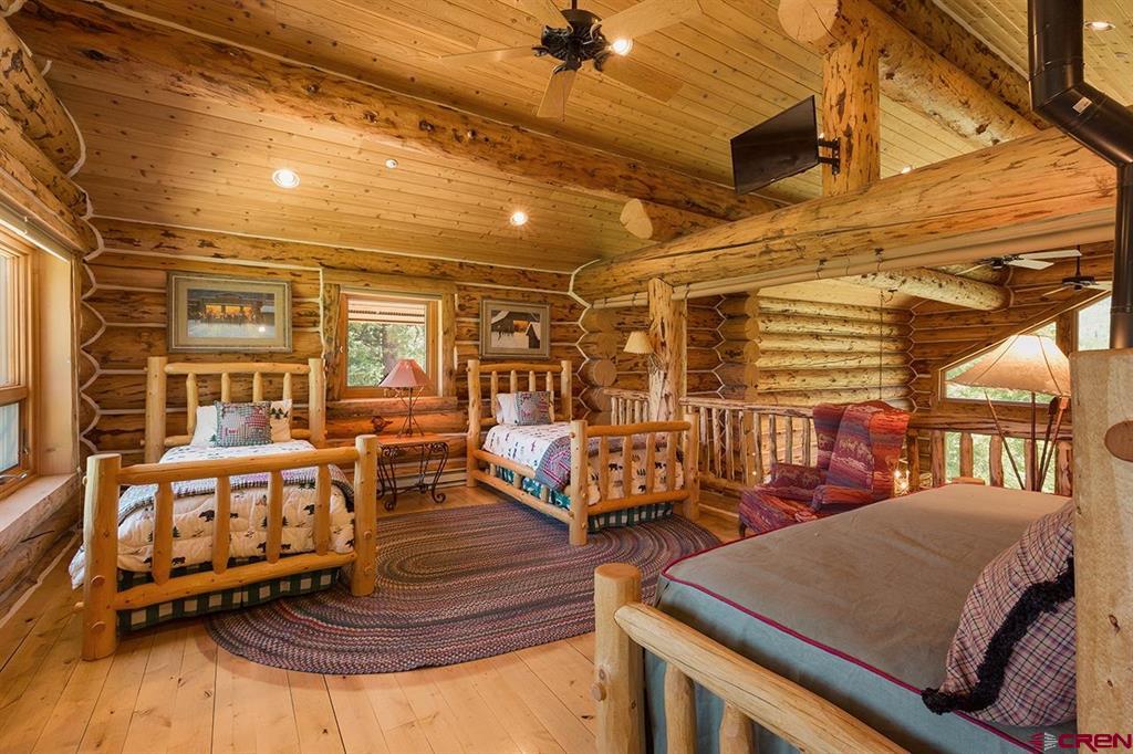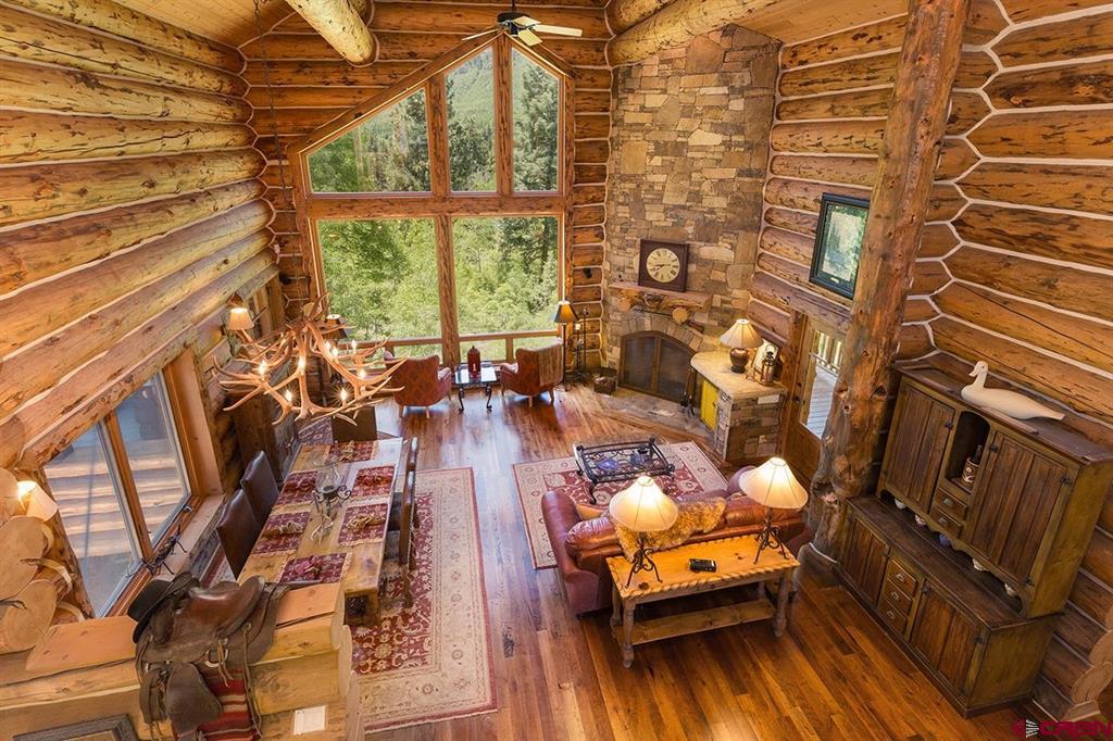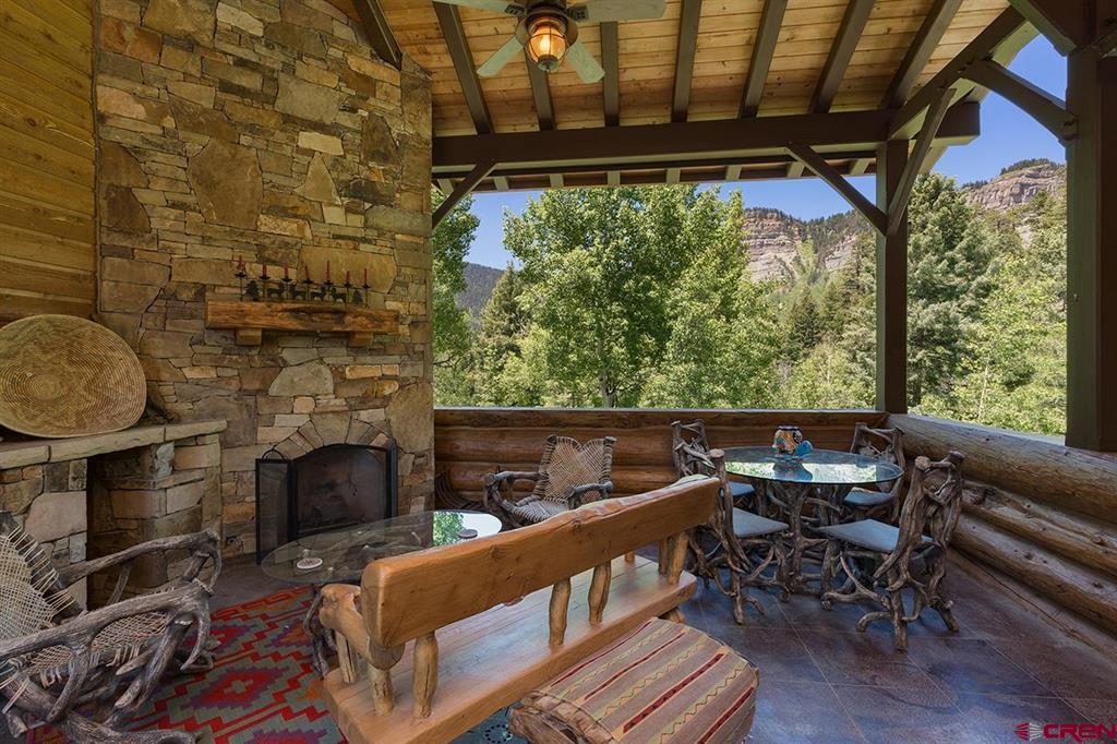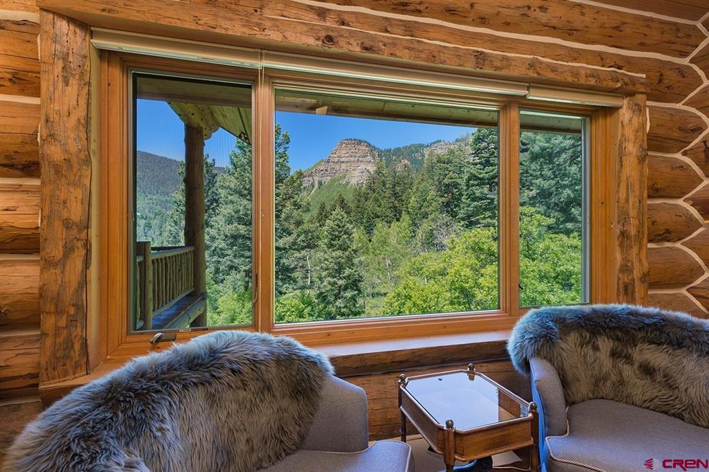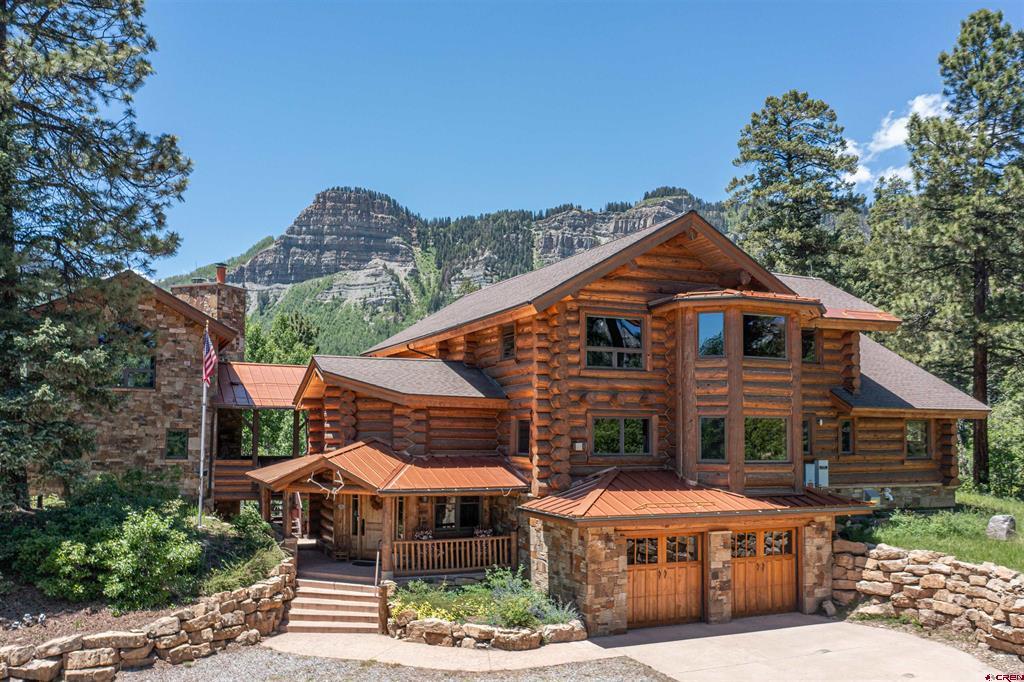 ~~~ A spectacular property in the ultimate idyllic mountain setting! This quintessential Engelmann Spruce custom log home is tucked amongst pine and aspen groves with dramatic views of the Hermosa Cliffs, the Needles 14,000 foot peaks and backs directly to thousands of acres of the San Juan National Forest, literally right out the back door. What more could you ask for? …. Except to be less than two miles from the ski resort, with privacy and serenity unrivaled in the area! ~~~ The homes’ classic elegance is deliberately designed to reflect traditional log style with burnished plank tile, and stone floors, wood burning fireplaces, large split log sills, handsome tile countertops and fixtures, plus a refurbished 1900’s parlor stove for heat and vintage character! Old world craftsmanship is evident in the exquisite dry-stack masonry with the tower-like curved exterior walls and in the stunning stone floor-to-ceiling Rumford fireplace in the great room, designed to reflect the Hermosa Cliffs formation to the West. The level of care taken with design and construction of this log gem is apparent both in the aesthetics and behind the scenes. ~~~ The vaulted great room, with huge vertical windows, captures the magnificence of Castle Rock and is open to the formal dining area and the kitchen, with a cozy breakfast nook looking east at the fabulous view of the Needles Mountains. Wake up to another amazing vista from the main floor Primary suite, hang out on the window seat or in the jetted tub with its own picture window. The upper level is a spacious loft bedroom with its own bath and yet another panorama. Then everyone’s favorite… the charming stone guest cottage complete with kitchenette and full bath…which is attached by a unique covered porch featuring an outdoor fireplace and east/west views! The walk-out lower level hosts the family room, complete with a period bar, plus a large multipurpose bonus room potentially an extra guest space, work-out, game, or media room with access to the outdoor patio and covered hot tub. There are just so many sweet spots to curl up with a book or just stare at the views it is hard to decide. ~~~ The attention to detail is not just on the surface, it carries through into the systems running the home. The in-floor heat, with a new 2022 boiler, has multiple zones for fine tuning as needed. Plus a new state-of-the-art remotely controlled security system with nine cameras, plus automated lighting and thermostats. Not to mention the backup systems: for heat with the wood burning parlor stove and gas started fireplaces, for water with a 1500 gallon water cistern in the utility room serviced by a good producing well, and for power with a propane fueled generator. Note that electricity is underground beneath the Forest Service and subdivision access road. There is also ice melt, water detection and fire suppression systems in the home along with lightening rods. Nothing has been overlooked for comfort and functionality! ~~~ Columbine Subdivision POA annual fee is variable and covers the Trash dumpster out front, Road maintenance and Snow removal which is based on linear distance of road (and for snow includes driveway). There are some other variable or optional fees. Short time rentals are not permitted in subdivision. ~~~ All that remains is to enjoy both unparalleled privacy and convenience! This little-known neighborhood, with only a few homes and landlocked by Forest Service, is only ¾ mile off the Hwy 550 corridor but one of the rare locations in the north county where you can’t see or hear the highway. ~~~ Unlock this hidden secret, with its private access and views everywhere you look!!!
