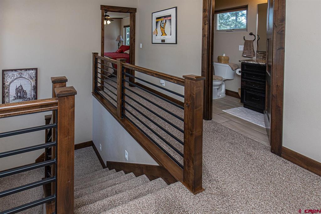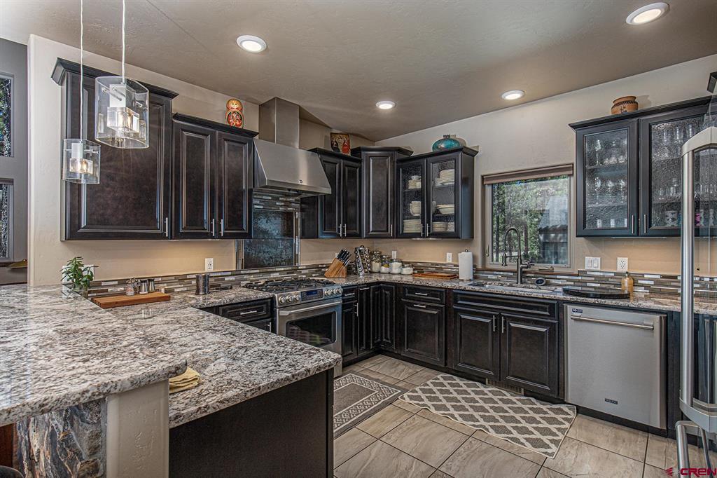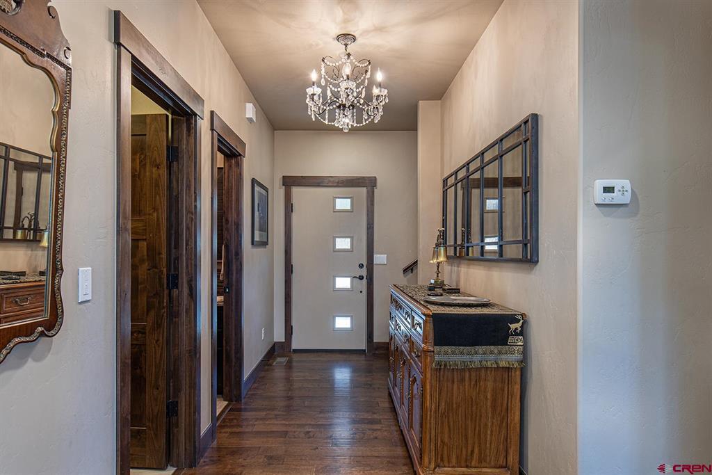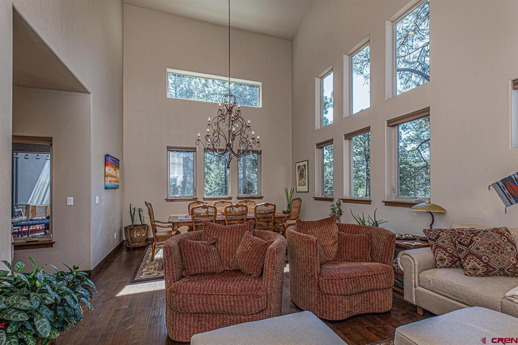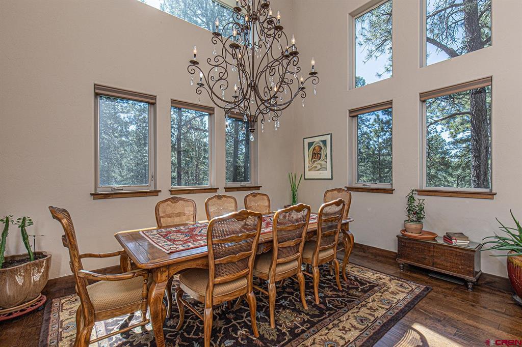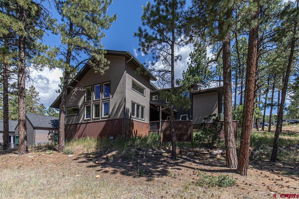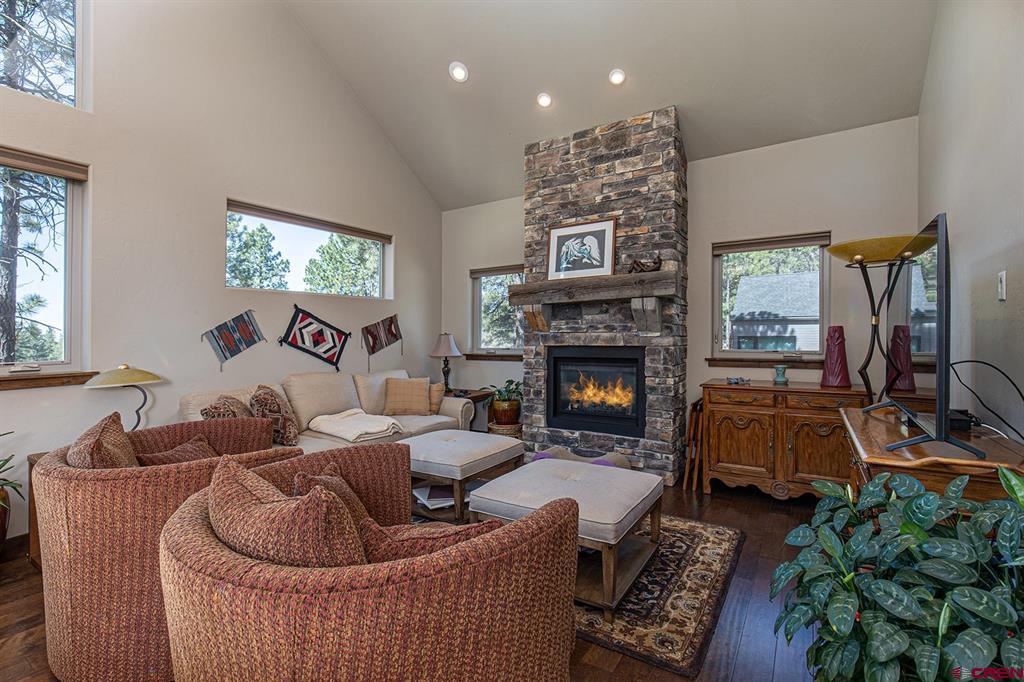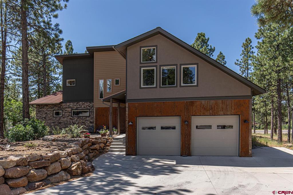 Located in the desirable Edgemont Highlands neighborhood, this meticulously maintained 4-bedroom home built by Tailor Made Custom Homes offers the quintessential Colorado experience from the moment you step inside with an ideal floor plan and luxury finishes. Attention to detail is apparent with the beautiful engineered wood floors leading you into the living and dining areas with vaulted ceilings and a wall of windows bringing in plentiful natural light while showcasing the surrounding pines, and floor-to-ceiling stone fireplace as the great room's focal point for large gatherings or a cozy evening at home. The gourmet kitchen features custom designed cabinets with glass insets, granite countertops, breakfast bar with a brick accent wall, farm sink, pantry with pullout drawers, 6-burner GE Cafe gas range with griddle, GE range hood, refrigerator and microwave, and a Maytag dishwasher. Entertaining is easy with sliding doors leading you to an exterior courtyard space, sheltered from the elements with views of the surrounding pines. The functional floor plan also offers a main level primary suite, an additional half bath with glass vessel sink, and mudroom/laundry room with built-in storage leading you to the oversized 2-car garage, perfect for all of your gear. The second level of the home hosts two bedrooms with a full bath in between, as well as a large 4th bedroom which easily functions as bonus/game room, home office, or guest quarters with generous closet and storage space. Other features of the home include air conditioning, tankless on-demand water heater, high efficiency furnace, an oversized 2-car garage, and a large concrete driveway with extra parking spot on the side of the house. Encompassing over 500 acres, of which almost 200 acres is devoted to open space, the Edgemont Highlands community is located just five miles from downtown Durango and features private access to over 1.5 miles of Florida River hiking and blue-ribbon fishing, a beautiful Community Center just a short walk away, and over ten miles of private hiking and walking trails, including the Pioneer Trail on the far western end, providing bicycle friendly direct access to the National Forest.