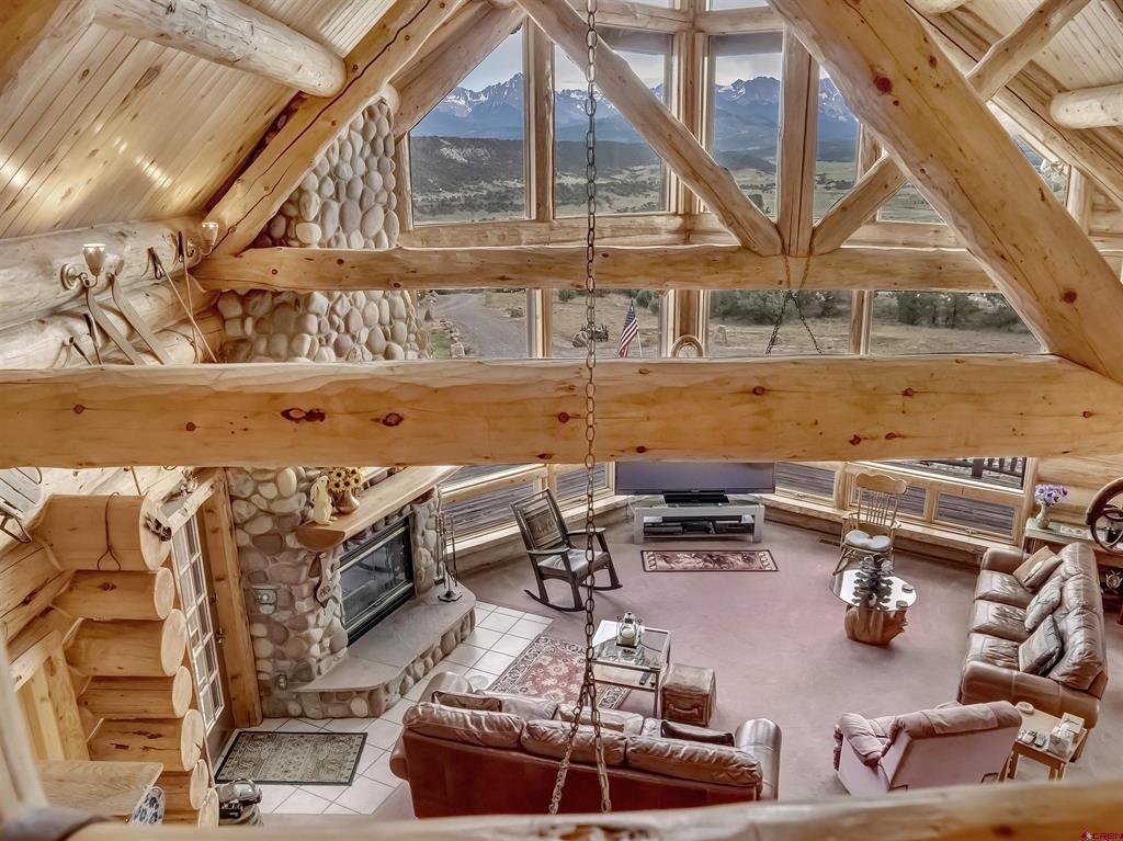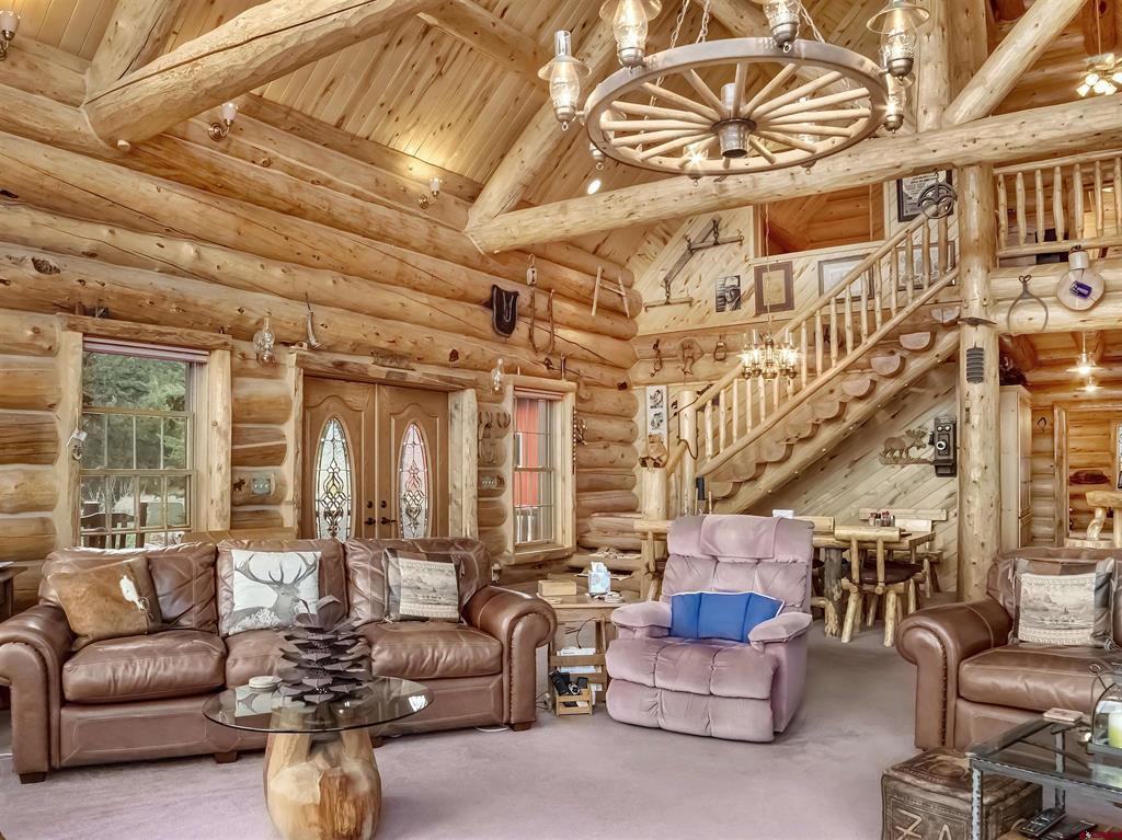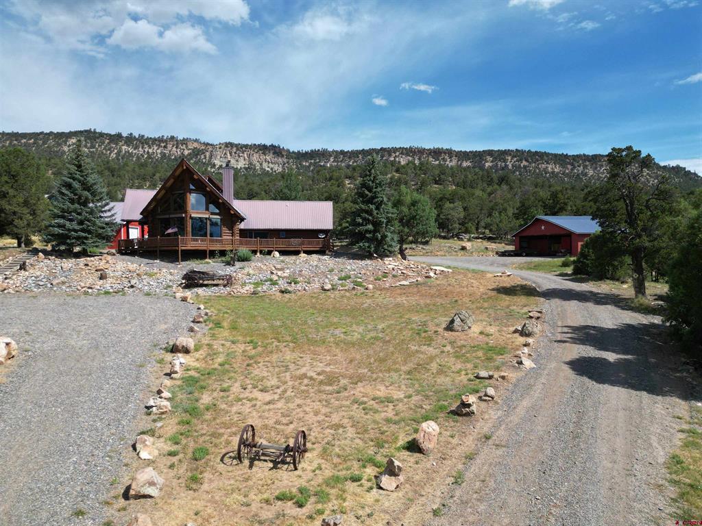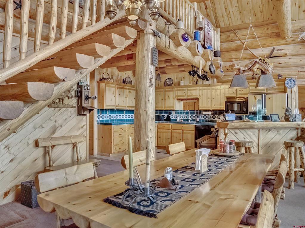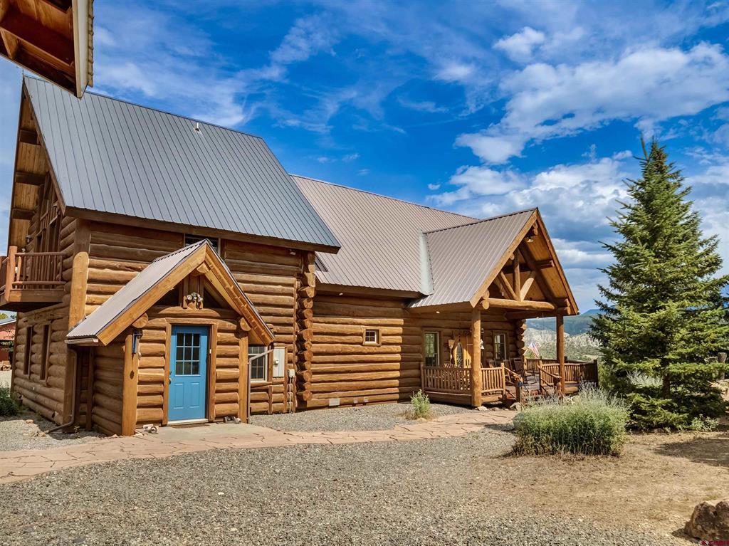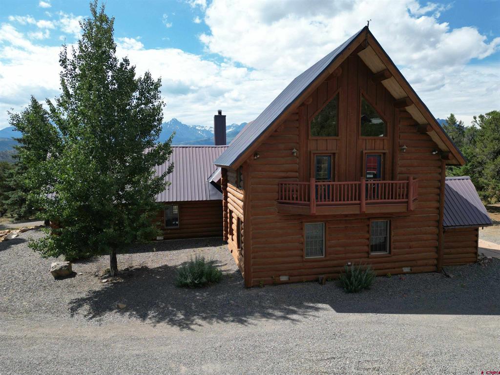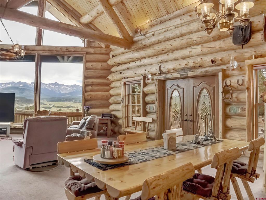This Yellowstone lodge style log home sits on a nicely treed 5 acre parcel with views of the Cimarron range, the Sneffels range and the valley floor. Just a few miles west of Ridgway's RAT bike trails and 30 miles to Telluride, where there is world class skiing, golfing, mountain biking, fly fishing and restaurants. Only 17 miles to beautiful Ouray with a Hot Spring pool, two Via Ferrata's, Ice Climbing Park and outstanding hiking, snowshoeing, cross country skiing and restaurants. This would make a beautiful basecamp for the outdoor enthusiast. In the country enough to not feel the impact of the tourist season, yet just a few minutes from great restaurants, grocery shopping and the wonderful little community of Ridgway. The house has 3,815 square feet with five bedrooms, three baths, a 32X60 garage/barn, and a 30X48 pole barn for RV and other storage. The two story windows frame the Sneffels range and the valley floor. Beautiful Aspen tongue-n-grove on the interior walls, half log stair case, and a gorgeous river rock fireplace all make this home feel warm and welcoming. There is a very nice deck that wraps around the front of the house. A nice flagstone pathway connects the front door, door the the mud room and garage/barn. The primary bedroom and bath are on the main level, along with another bedroom, den/game room, bathroom, and great room, with a nice dining area, living room and kitchen with a southwest flair. The upper floor has three bedrooms, a full bath and a nice loft sitting area that could be used as an office. Horses are allowed in this HOA. You can have up to four. The place has been lovingly cared for. It's a family home where lots of love has been shared. The setting is so tranquil and peaceful. Come see this place for yourself.