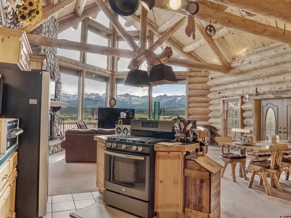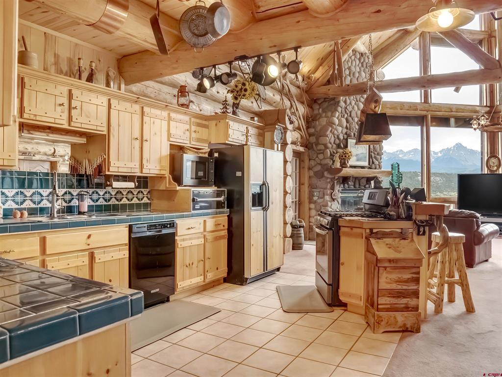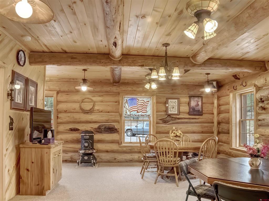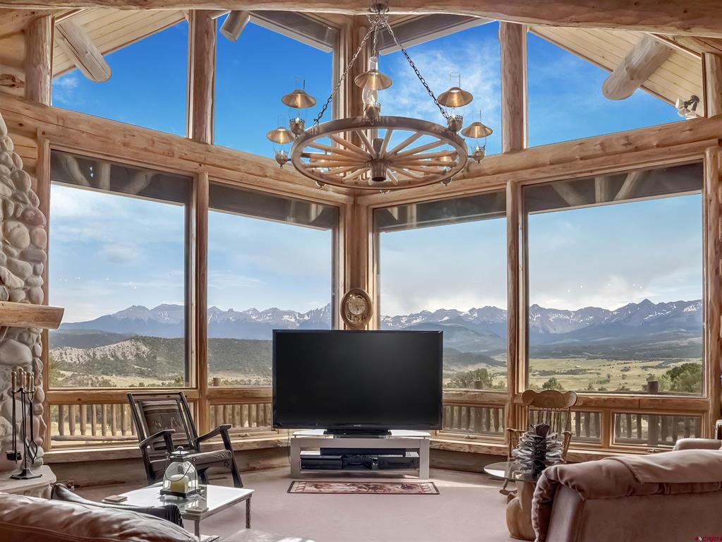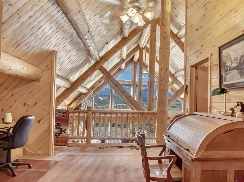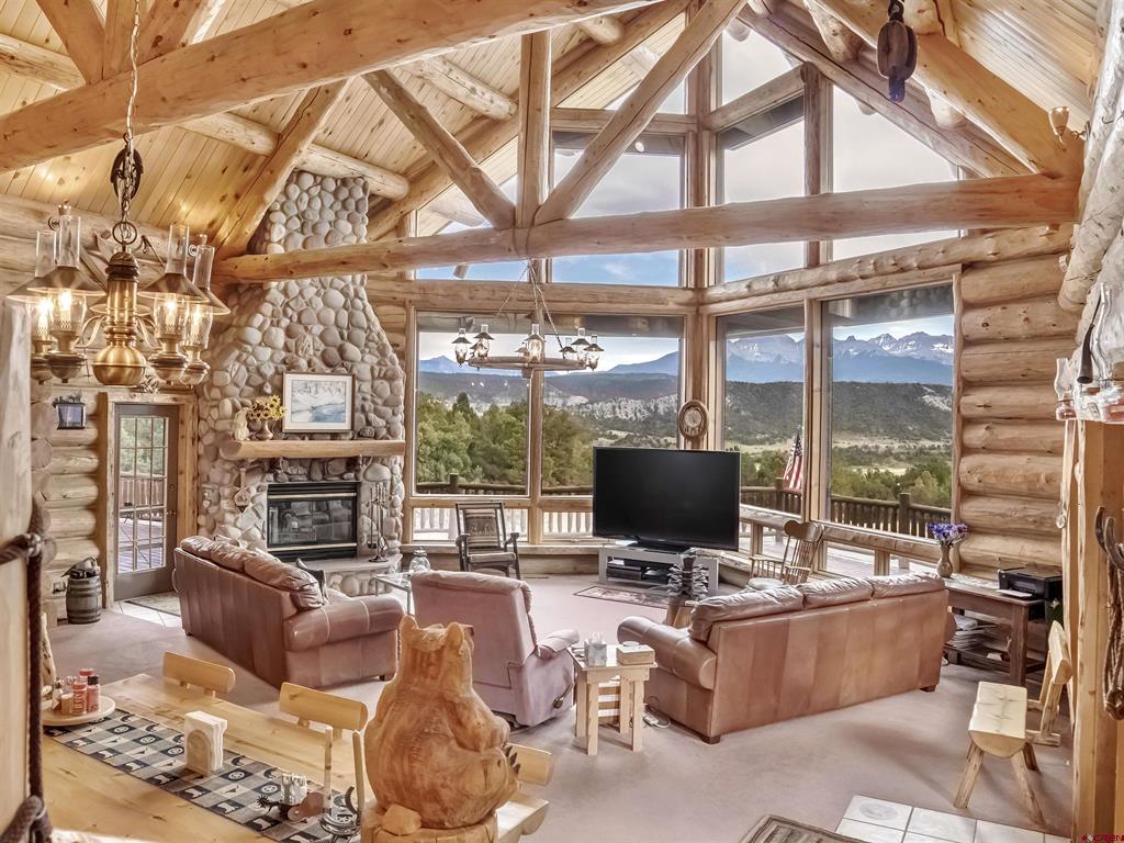This Yellowstone lodge style log home sits on a nicely treed 5 acre parcel with views of the Cimarron range, the Sneffels range and the valley floor. Just a few miles west of Ridgway's RAT bike trails and 30 miles to Telluride, where there is world class skiing, golfing, mountain biking, fly fishing and restaurants. Only 17 miles to beautiful Ouray with a Hot Spring pool, two Via Ferrata's, Ice Climbing Park and outstanding hiking, snowshoeing, cross country skiing and restaurants. This would make a beautiful basecamp for the outdoor enthusiast. In the country enough to not feel the impact of the tourist season, yet just a few minutes from great restaurants, grocery shopping and the wonderful little community of Ridgway. The house has 3,815 square feet with five bedrooms, three baths, a 32X60 garage/barn, and a 30X48 pole barn for RV and other storage. The two story windows frame the Sneffels range and the valley floor. Beautiful Aspen tongue-n-grove on the interior walls, half log stair case, and a gorgeous river rock fireplace all make this home feel warm and welcoming. There is a very nice deck that wraps around the front of the house. A nice flagstone pathway connects the front door, door the the mud room and garage/barn. The primary bedroom and bath are on the main level, along with another bedroom, den/game room, bathroom, and great room, with a nice dining area, living room and kitchen with a southwest flair. The upper floor has three bedrooms, a full bath and a nice loft sitting area that could be used as an office. Horses are allowed in this HOA. You can have up to four. The place has been lovingly cared for. It's a family home where lots of love has been shared. The setting is so tranquil and peaceful. Come see this place for yourself.
