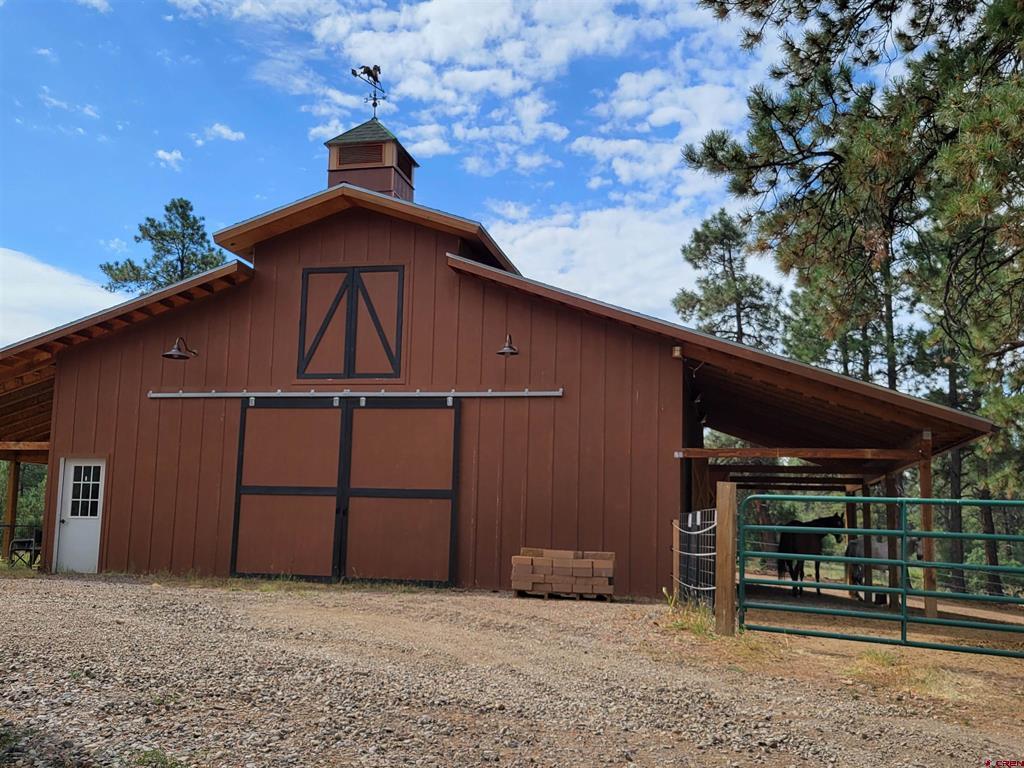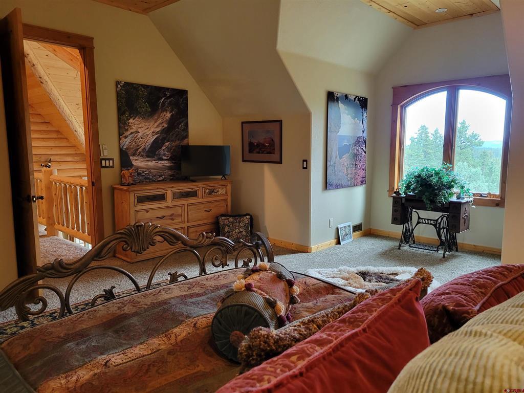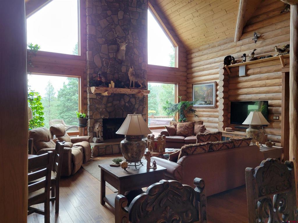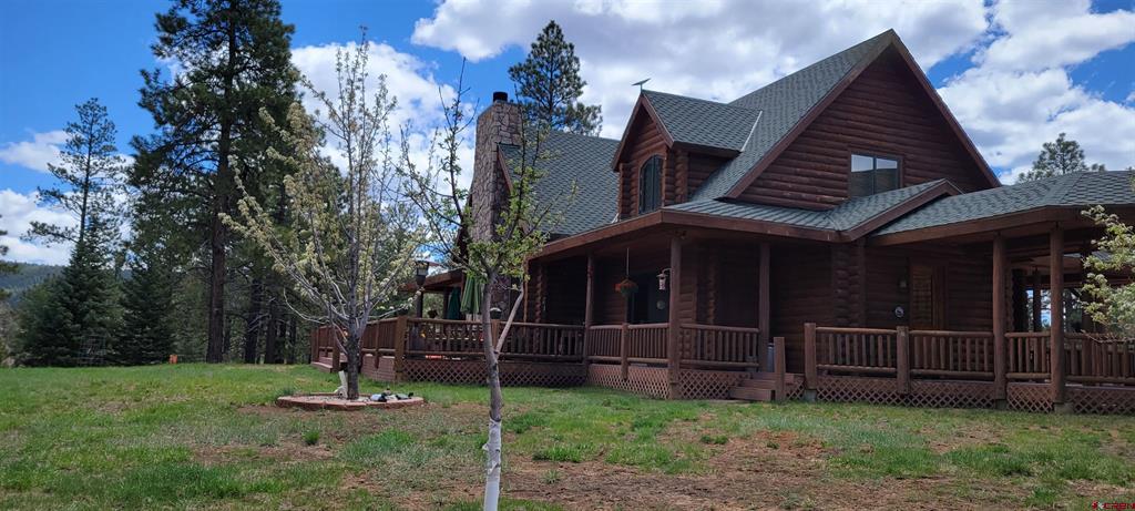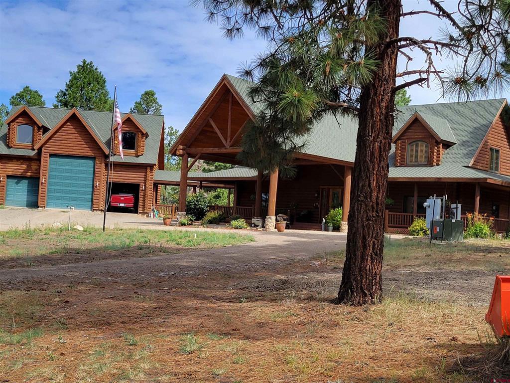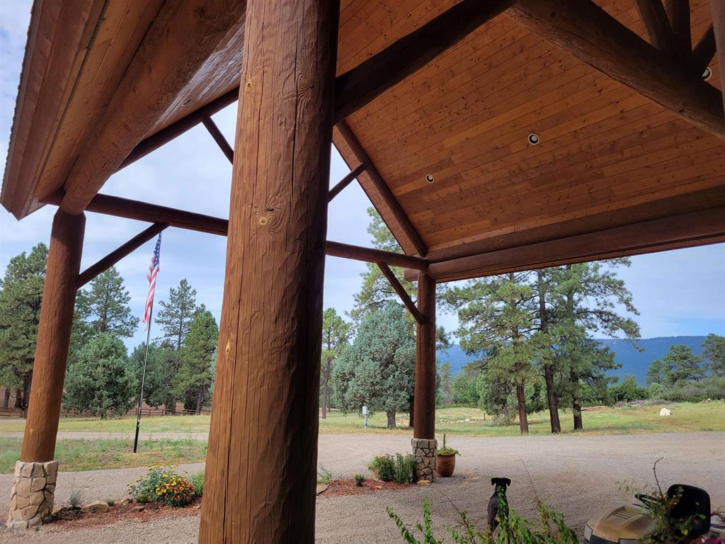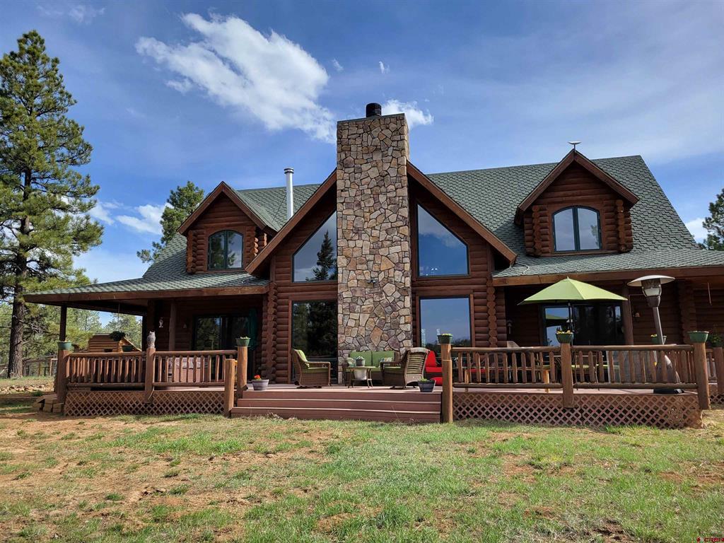 Welcome to the luxury of Log Cabin Living at Hidden Bear Ranch, a stunning mountain home located 25 miles south of our beautiful town, Pagosa Springs in Alpine Lakes Ranch. Perched high on Elk Ridge you will be drawn to the amazing views, dense forest and privacy. This spacious residence spans 3955 square feet and offers a unique blend of rustic charm and modern amenities. High ceilings & all 8 foot solid alder doors with 4 bedrooms & 3 baths this home is perfect for those seeking a comfortable and flexible living space. Reminiscent of a Grand Lodge the porte cache shelters you and your guests as you arrive. As you step inside, you'll immediately notice the open concept design, & 18 foot rock wall wood burning fireplace. There is a seamless flow throughout the home with 2 dining areas along with the chef's kitchen. It boasts alder cabinetry, stainless steel built in appliances, making it a joy to cook and entertain in. Picture yourself preparing meals while enjoying the breathtaking views of the majestic San Juan Mountains. Pantry & Mud Room keep all your food, groceries and items not used all in plain view with easy access. A full wet bar and wine refrigerator has more than ample storage for all your liquors and bar glasses & accessories. Primary ensuite is on the main level with outdoor access to the deck & built in hot tub. which is prefect for enjoying the natural surroundings. Soak and enjoy the stunning sunsets and endless starry nights. Huge walk in shower and a corner tub & walk in closet with cedar ceilings are just a few of the too many features to list here as you must visit this retreat to get the full effect. A 3/4 bath and an additional bedroom/currently used as an office complete the main level. Pecan wood floors throughout. Upstairs boasts a spacious game room in the loft and 2 huge bedroom suites. One full bath with deep soaking clawfoot tub, custom aromatic counters and mirrors with the wood sculpted from the property. One of the standout features of this property is the presence of a 30 KW solar system. Last electric bill was $33.00 with the A/C running. During colder evenings, you can cozy up next to one of the 2 rock fireplaces, located in the living area or primary bedroom creating a warm and inviting atmosphere. Additionally, the fully conditioned crawl space is spacious enough to accommodate the installation of in-floor radiant heat in the primary bath. Geo thermal provides heating & yes Air conditioning as well as instant hot water throughout the home. Step outside and discover the full wrap around deck and back entertainment area. A covered breezeway leads you to the detached 3-car garage, complete with a work shop and storage. RV parking is available. 2 outdoor log sheds are home to a chicken house with a fenced-in yard, ideal for raising a small flock of chickens. Chickens included with sale as there is nothing like the taste of fresh eggs. The pear trees are loaded with fruit and will produce a good harvest this year. If you're an equestrian enthusiast or simply appreciate the charm of a barn, this property has you covered. There's a two-story barn with 3 horse stalls, a hay loft, wash bay & shop and an enclosed tack room. Situated on a sprawling 35 -acre lot, this property provides ample space for outdoor activities and exploration. POA maintains roads year round, property backs to BLM & you can hunt on your own property. All underground utilities including central water. Property has had extensive fire mitigation completed. Embrace the beauty of the Colorado landscape and indulge in the tranquility and serenity of this exceptional mountain retreat home. Experience the perfect blend of artistry, comfort, and natural beauty in one remarkable package.