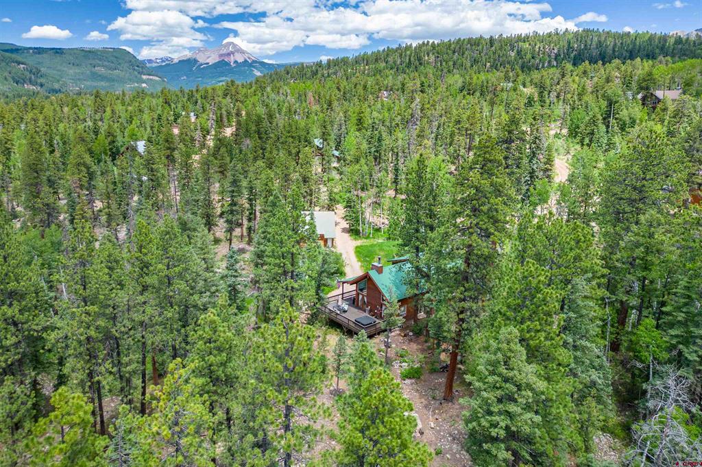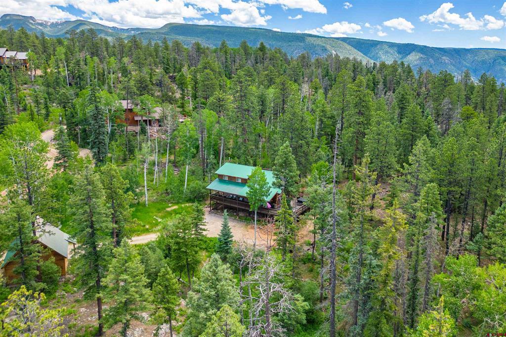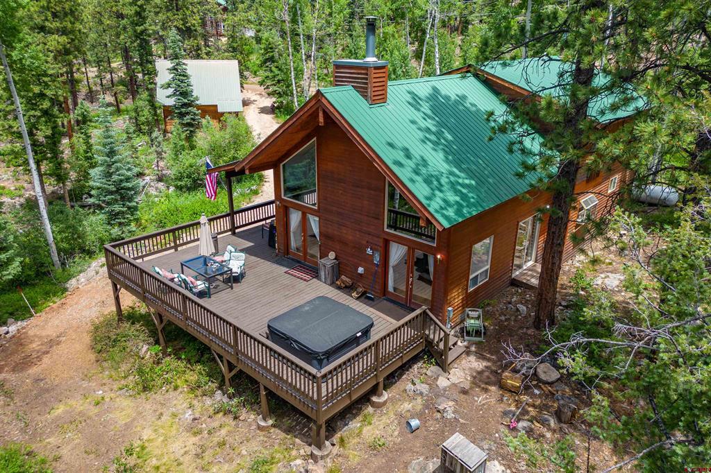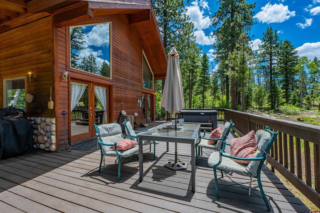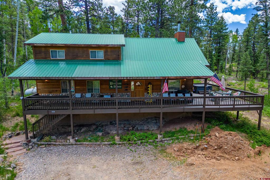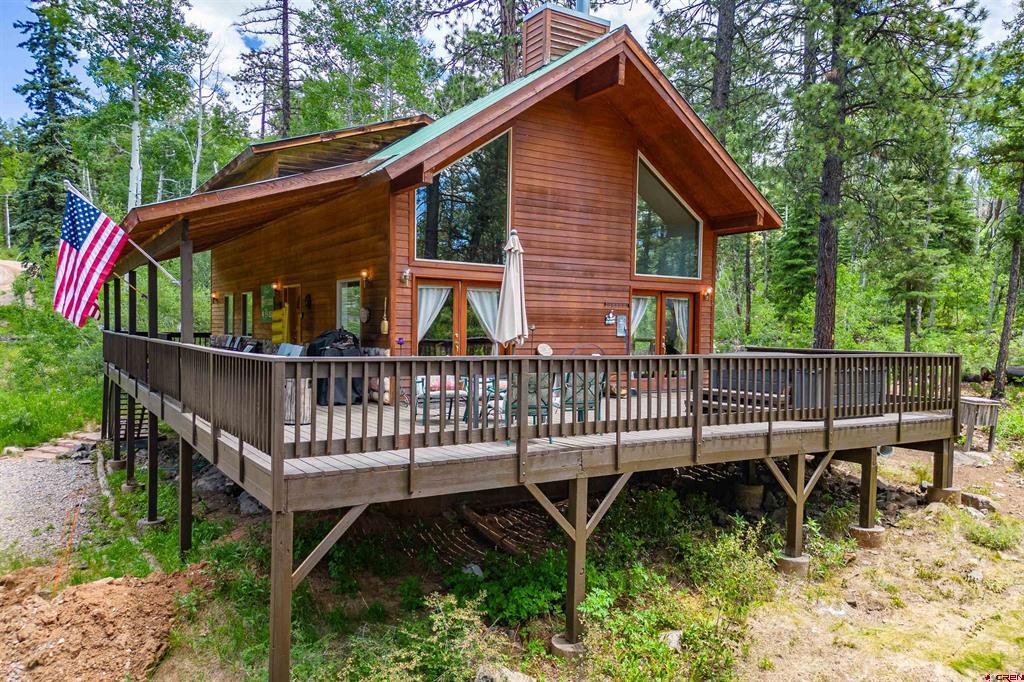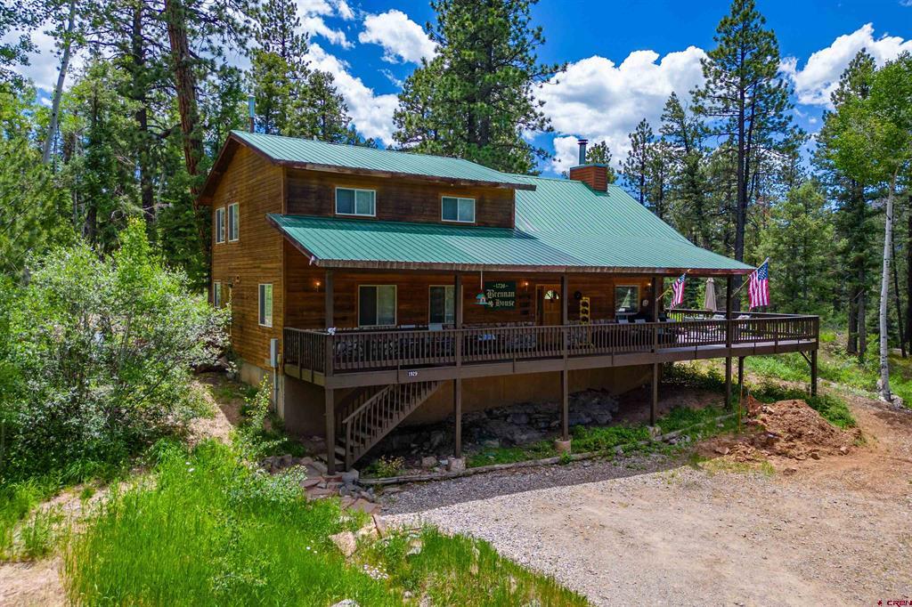 True Colorado home in the mountains, set up against the tall pines, bordering thousands of acres of National Forest, close to lakes, minutes to Purgatory for skiing, and the ultimate Colorado mountain living. With the spacious deck wrapping two sides of the home, allowing enjoyment of the mountain views, the whispering pines, and the cool mountain air 365 days a year. Offering over 1,850 square feet, two bedrooms on the main level and a huge loft upstairs, this home makes a great second home, primary residence, or a short-term rental that sleeps over 12 people. The main level features a living room with vaulted ceilings, log accents, a massive river rock fireplace, perfect for winter nights cuddled in during a winter snow fall. An abundance of natural light through the windows on the main level with the living, dining, and kitchen sharing the entertainment space. Spacious bedrooms, hall bath, and a good size laundry room make up the first floor. Second story features a space perfect for a home office or bunk beds for guests, while also having a secondary loft area that fits two more queen beds. The upstairs bath area is a dream space with huge tub looking to the pines and mountains. Detached, oversized two garage has plenty of room for getting the vehicles out of the snow, but also offers an unfinished bonus room that would be a perfect game room, media room, home office, or a place to hang out while on vacation. Fully covered front deck with mountain views, side deck featuring a brand new hot tub, with the back yard only steps into National Forest. This Colorado Mountain Home will not last, close to town of Durango, minutes to golfing at Glacier, skiing at Purgatory, or a hike in the National Forest, don’t miss this charmer.