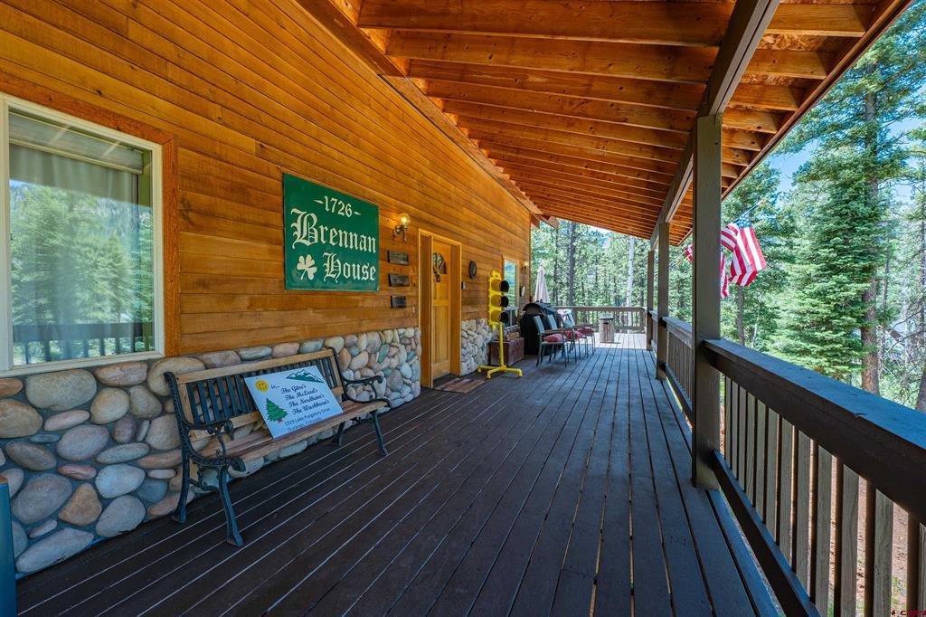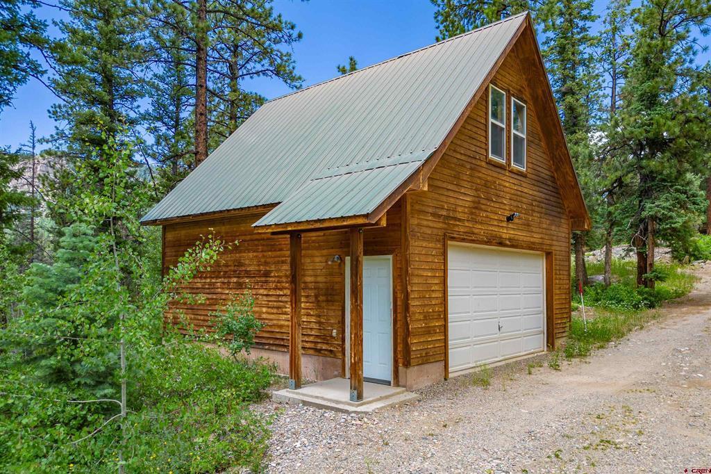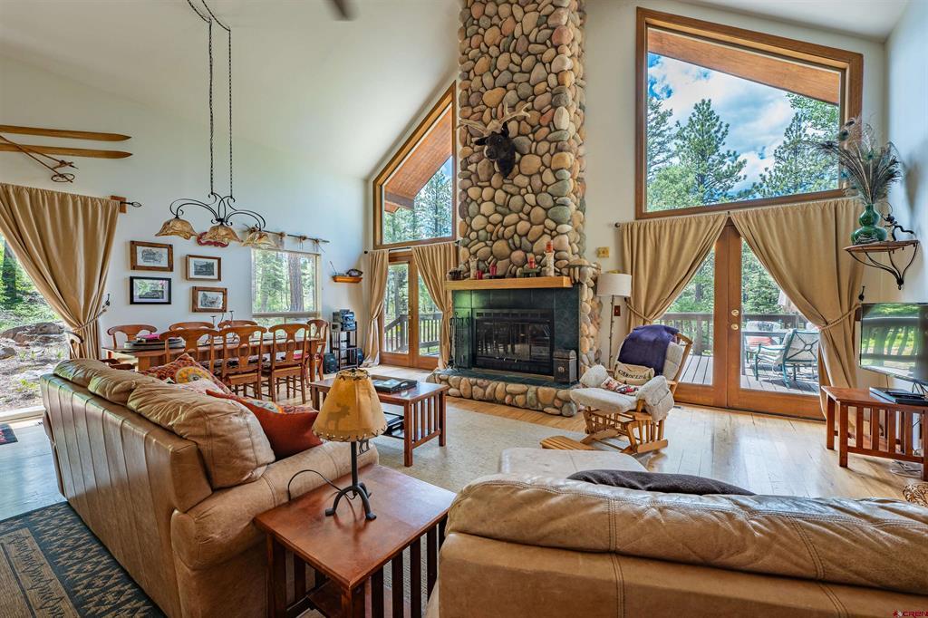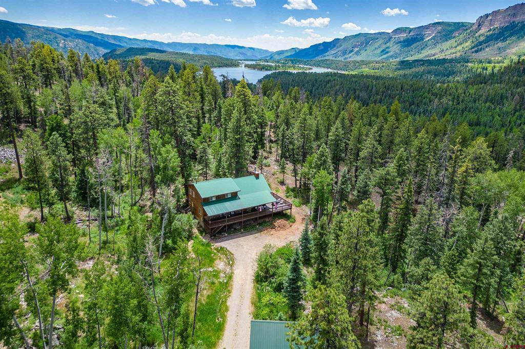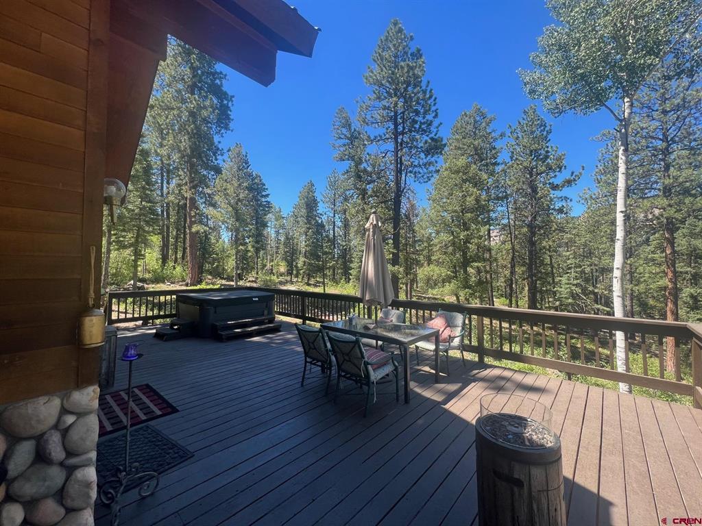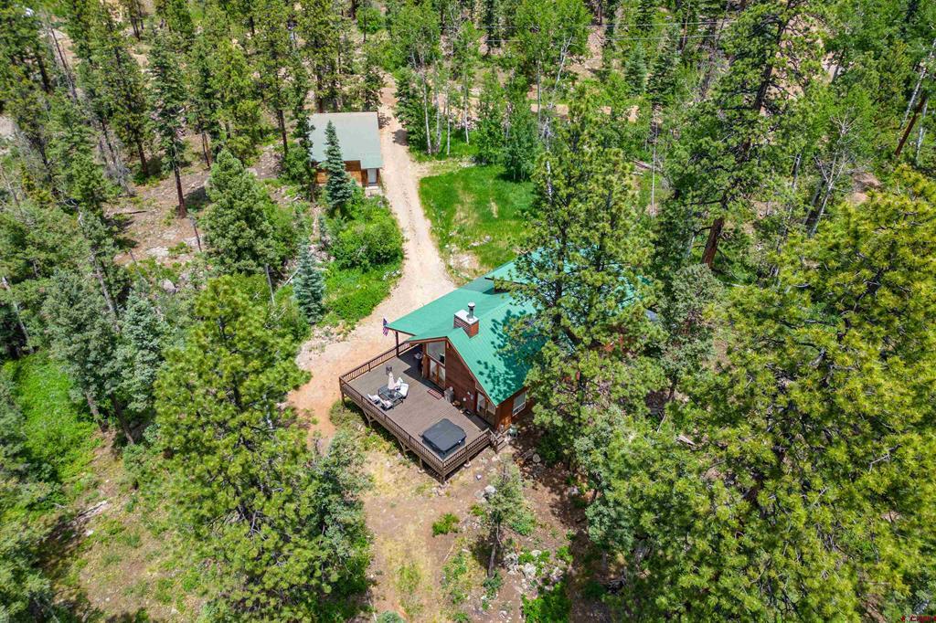 True Colorado home in the mountains, set up against the tall pines, bordering thousands of acres of National Forest, close to lakes, minutes to Purgatory for skiing, and the ultimate Colorado mountain living. With the spacious deck wrapping two sides of the home, allowing enjoyment of the mountain views, the whispering pines, and the cool mountain air 365 days a year. Offering over 1,850 square feet, two bedrooms on the main level and a huge loft upstairs, this home makes a great second home, primary residence, or a short-term rental that sleeps over 12 people. The main level features a living room with vaulted ceilings, log accents, a massive river rock fireplace, perfect for winter nights cuddled in during a winter snow fall. An abundance of natural light through the windows on the main level with the living, dining, and kitchen sharing the entertainment space. Spacious bedrooms, hall bath, and a good size laundry room make up the first floor. Second story features a space perfect for a home office or bunk beds for guests, while also having a secondary loft area that fits two more queen beds. The upstairs bath area is a dream space with huge tub looking to the pines and mountains. Detached, oversized two garage has plenty of room for getting the vehicles out of the snow, but also offers an unfinished bonus room that would be a perfect game room, media room, home office, or a place to hang out while on vacation. Fully covered front deck with mountain views, side deck featuring a brand new hot tub, with the back yard only steps into National Forest. This Colorado Mountain Home will not last, close to town of Durango, minutes to golfing at Glacier, skiing at Purgatory, or a hike in the National Forest, don’t miss this charmer.