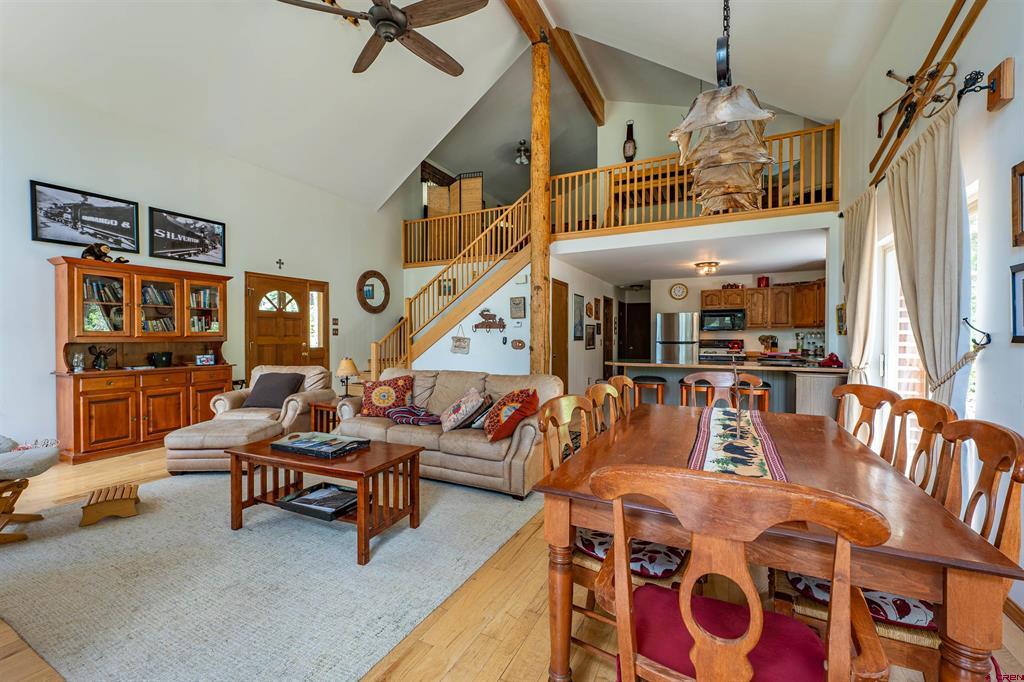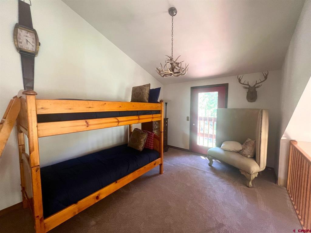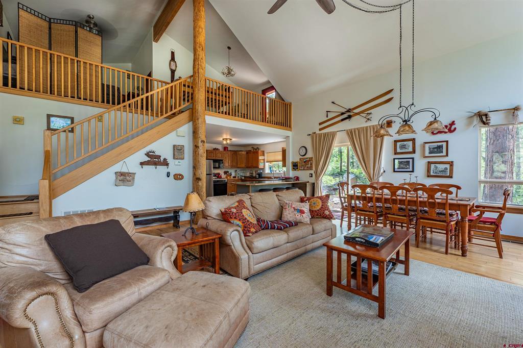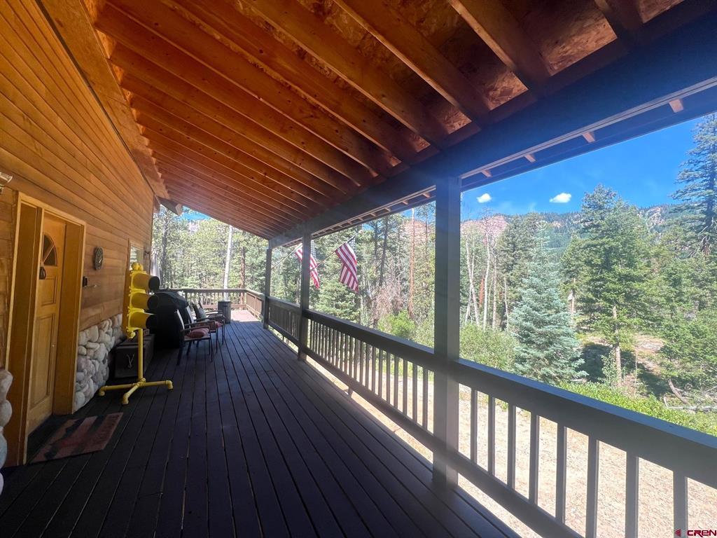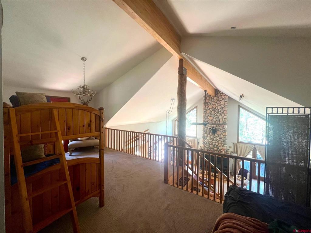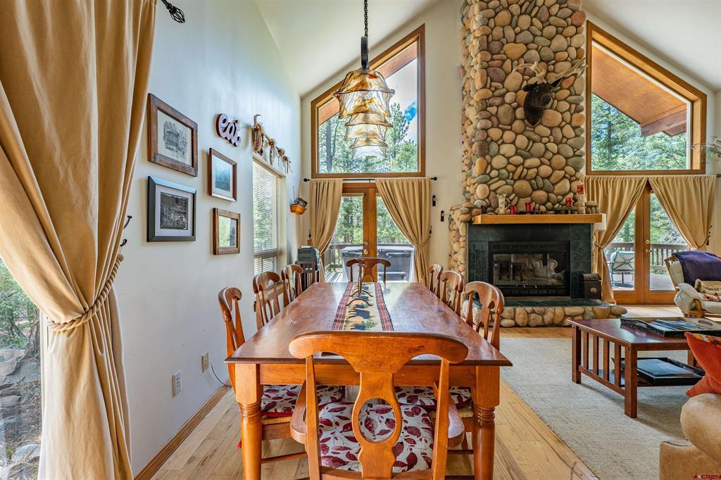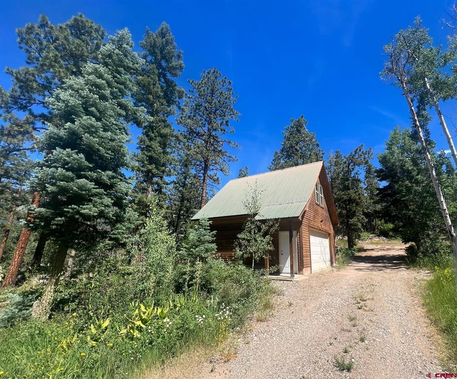 True Colorado home in the mountains, set up against the tall pines, bordering thousands of acres of National Forest, close to lakes, minutes to Purgatory for skiing, and the ultimate Colorado mountain living. With the spacious deck wrapping two sides of the home, allowing enjoyment of the mountain views, the whispering pines, and the cool mountain air 365 days a year. Offering over 1,850 square feet, two bedrooms on the main level and a huge loft upstairs, this home makes a great second home, primary residence, or a short-term rental that sleeps over 12 people. The main level features a living room with vaulted ceilings, log accents, a massive river rock fireplace, perfect for winter nights cuddled in during a winter snow fall. An abundance of natural light through the windows on the main level with the living, dining, and kitchen sharing the entertainment space. Spacious bedrooms, hall bath, and a good size laundry room make up the first floor. Second story features a space perfect for a home office or bunk beds for guests, while also having a secondary loft area that fits two more queen beds. The upstairs bath area is a dream space with huge tub looking to the pines and mountains. Detached, oversized two garage has plenty of room for getting the vehicles out of the snow, but also offers an unfinished bonus room that would be a perfect game room, media room, home office, or a place to hang out while on vacation. Fully covered front deck with mountain views, side deck featuring a brand new hot tub, with the back yard only steps into National Forest. This Colorado Mountain Home will not last, close to town of Durango, minutes to golfing at Glacier, skiing at Purgatory, or a hike in the National Forest, don’t miss this charmer.