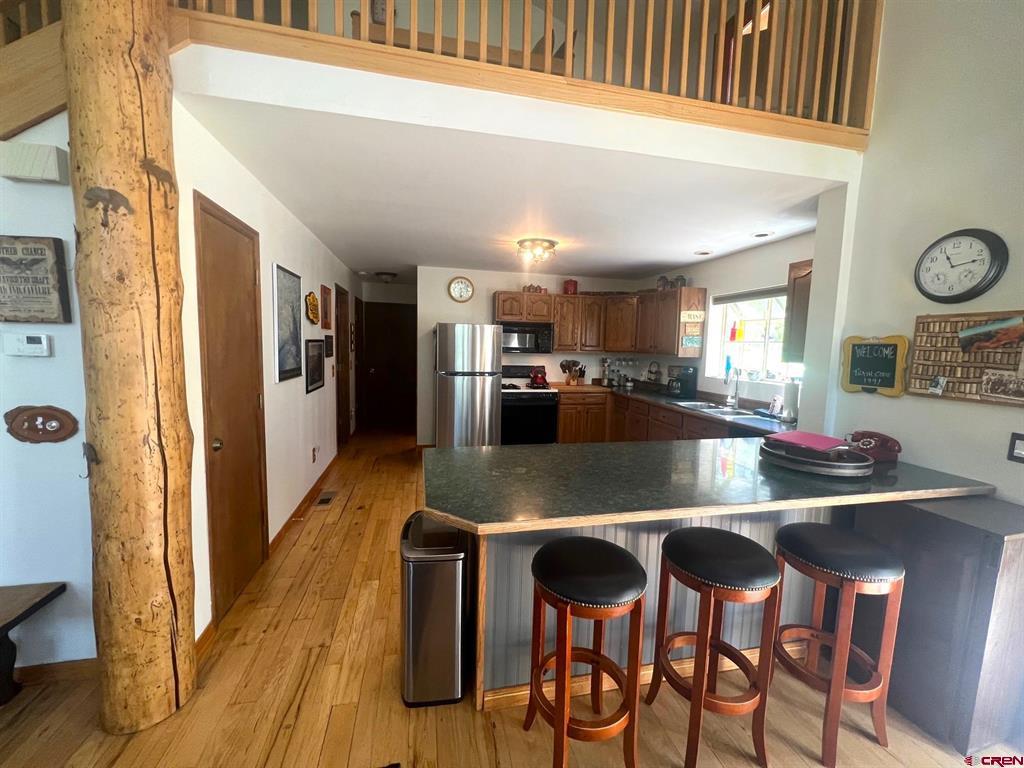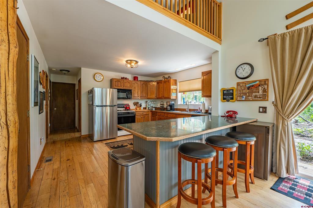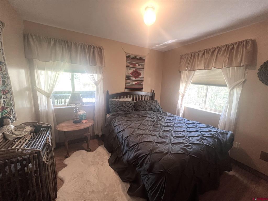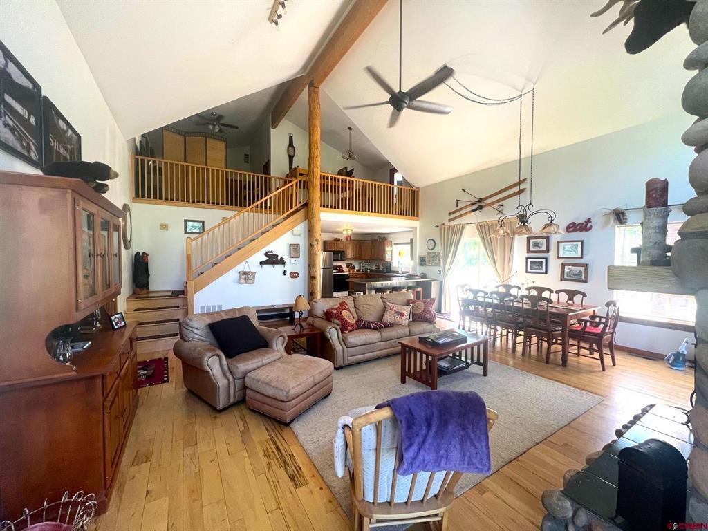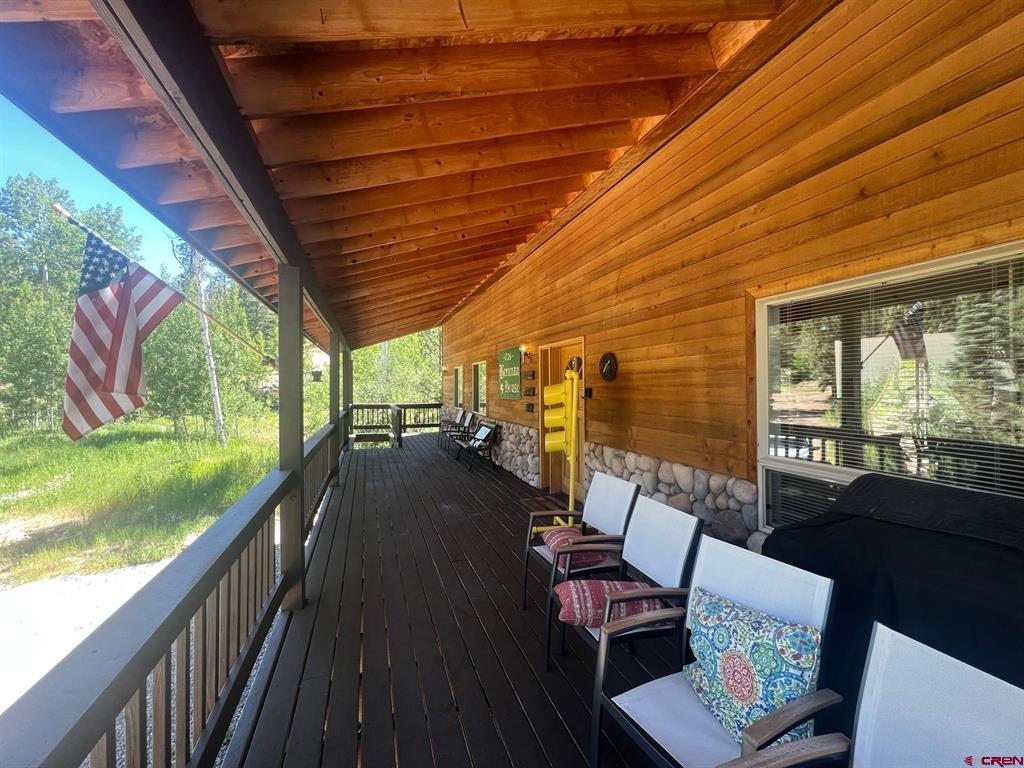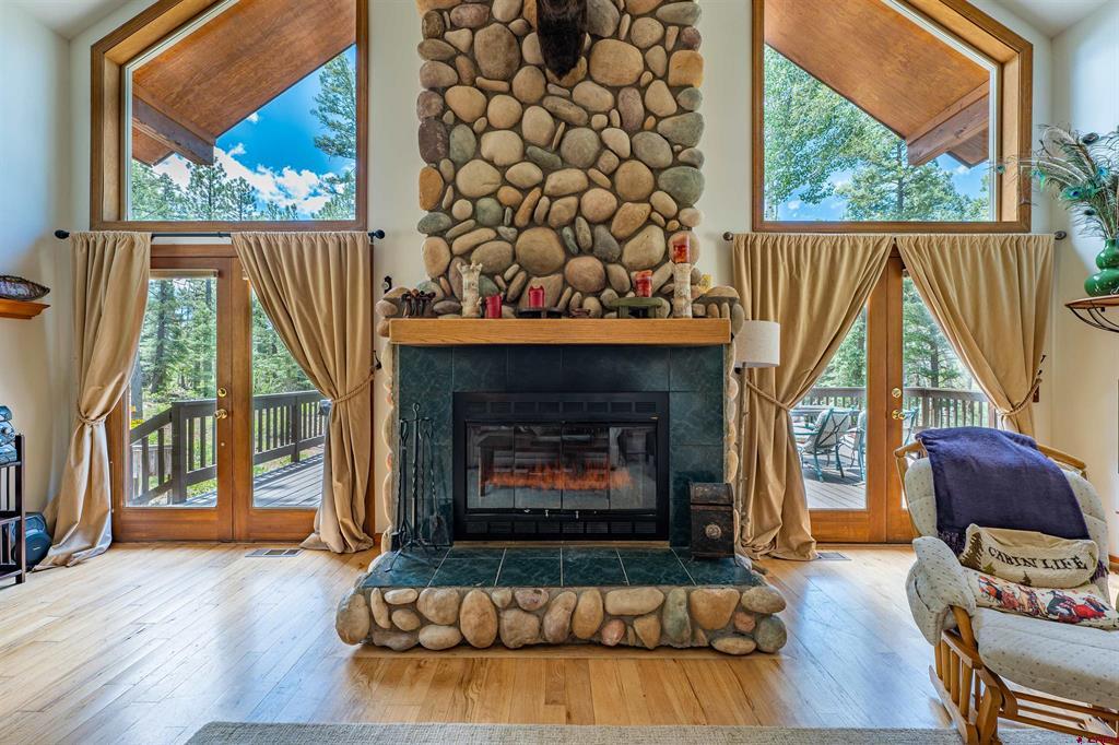 True Colorado home in the mountains, set up against the tall pines, bordering thousands of acres of National Forest, close to lakes, minutes to Purgatory for skiing, and the ultimate Colorado mountain living. With the spacious deck wrapping two sides of the home, allowing enjoyment of the mountain views, the whispering pines, and the cool mountain air 365 days a year. Offering over 1,850 square feet, two bedrooms on the main level and a huge loft upstairs, this home makes a great second home, primary residence, or a short-term rental that sleeps over 12 people. The main level features a living room with vaulted ceilings, log accents, a massive river rock fireplace, perfect for winter nights cuddled in during a winter snow fall. An abundance of natural light through the windows on the main level with the living, dining, and kitchen sharing the entertainment space. Spacious bedrooms, hall bath, and a good size laundry room make up the first floor. Second story features a space perfect for a home office or bunk beds for guests, while also having a secondary loft area that fits two more queen beds. The upstairs bath area is a dream space with huge tub looking to the pines and mountains. Detached, oversized two garage has plenty of room for getting the vehicles out of the snow, but also offers an unfinished bonus room that would be a perfect game room, media room, home office, or a place to hang out while on vacation. Fully covered front deck with mountain views, side deck featuring a brand new hot tub, with the back yard only steps into National Forest. This Colorado Mountain Home will not last, close to town of Durango, minutes to golfing at Glacier, skiing at Purgatory, or a hike in the National Forest, don’t miss this charmer.