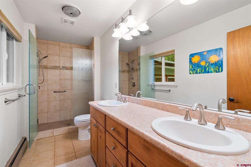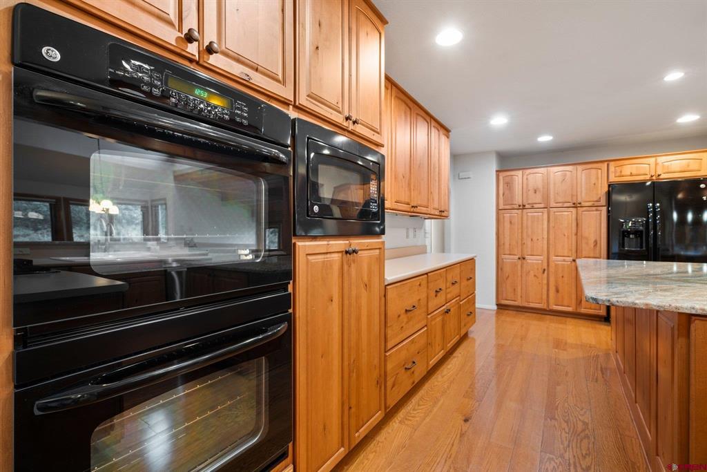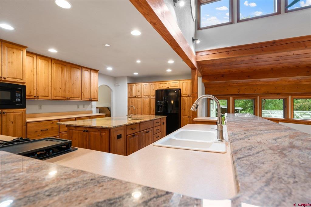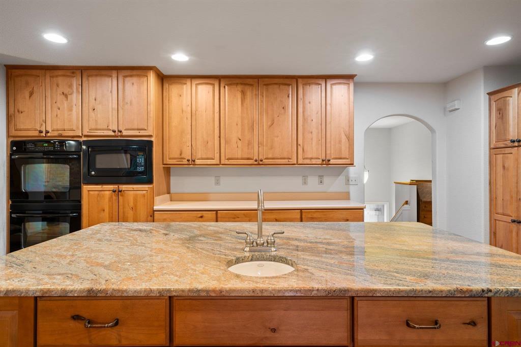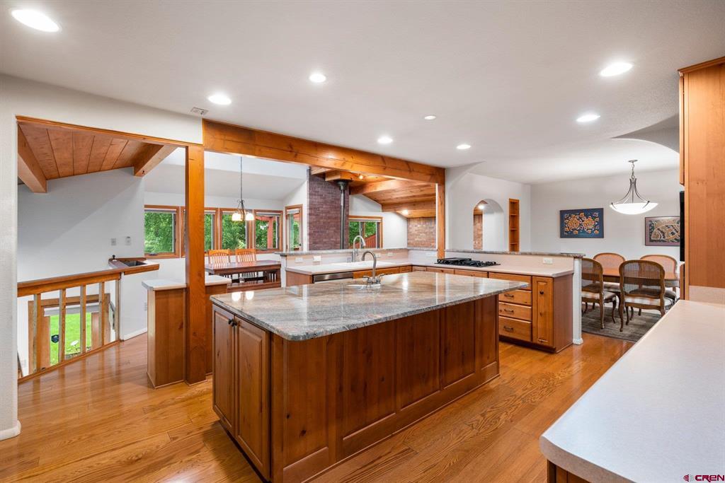 This exquisite updated split-level home is nestled on a generously sized lot in one of the most desirable locations in Durango. The in-town home backs to open space, offering unrivaled tranquility and privacy. This captivating residence boasts various features that cater to comfort, style, and functionality. Upon entering, you'll be greeted by an inviting atmosphere created by abundant natural light and attractive updates. The expansive chef's kitchen is the heart of the home, adorned with modern amenities catering to culinary enthusiasts. The double ovens, custom cabinets, and granite island with a convenient prep sink make it an ideal space for creating culinary masterpieces. Hardwood floors throughout the main level lead you through the open layout, connecting the spacious family rooms offering versatile relaxation and entertainment spaces. With three well-appointed bedrooms and three baths, including an updated primary bath, this home ensures everyone's comfort and convenience. Natural light pours in through the numerous windows, accentuating the beauty of the hardwood floors and the charming details such as the tongue and groove ceiling. The fireplace and woodstove provide warmth and ambiance during cooler seasons, creating an inviting space to gather with loved ones. Thanks to ample storage spaces thoughtfully integrated into the design, storage is never an issue. The hydronic baseboard heating system guarantees cozy winters, and the thoughtful layout promotes efficient cooling during the warmer months. Step outside to discover a serene oasis featuring mature landscaping, including a greenhouse for nurturing your green thumb. The .26-acre lot extends to the open space beyond, ensuring an uninterrupted connection to nature. The oversized two-car garage provides shelter for your vehicles and additional storage options. Built-in 1968, this home exudes timeless charm while seamlessly blending modern updates that complement its character. The desirable in-town location offers convenience to local amenities, shops, and restaurants, making this residence an ideal retreat that balances serenity with accessibility. Take advantage of the opportunity to own this remarkable split-level gem, where every corner reflects thoughtful design, comfort, and the joys of living in harmony with indoor elegance and natural beauty.